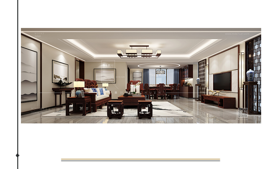 客餐廳區(qū)域,簡練的天花木線條使得空間更加精致,安靜的同時(shí),沙發(fā)前后背景以對稱的手法再結(jié)合雪花白大理石居中設(shè)計(jì)的方圓概念,配上厚重的紅木家私,新中式獨(dú)有的氣質(zhì)油然而生。