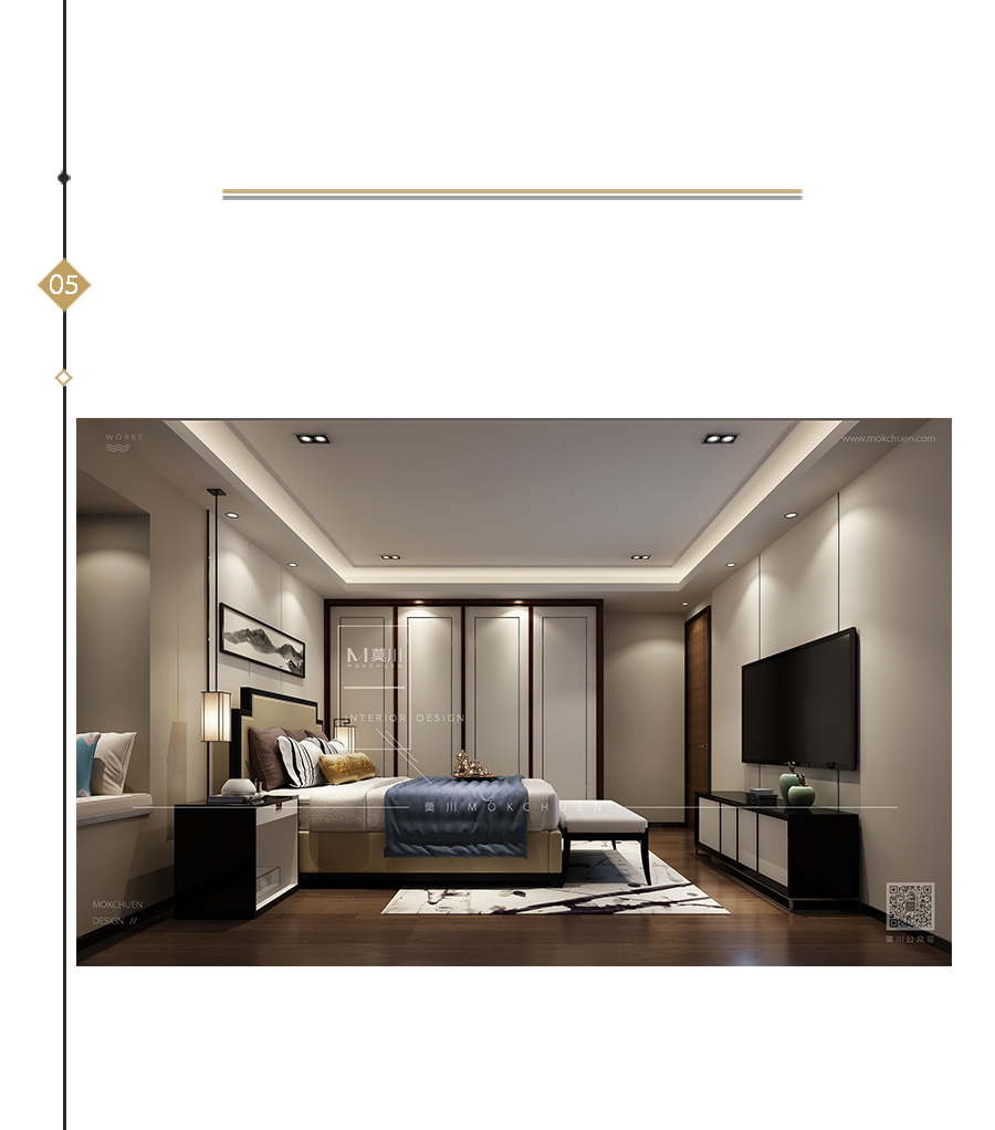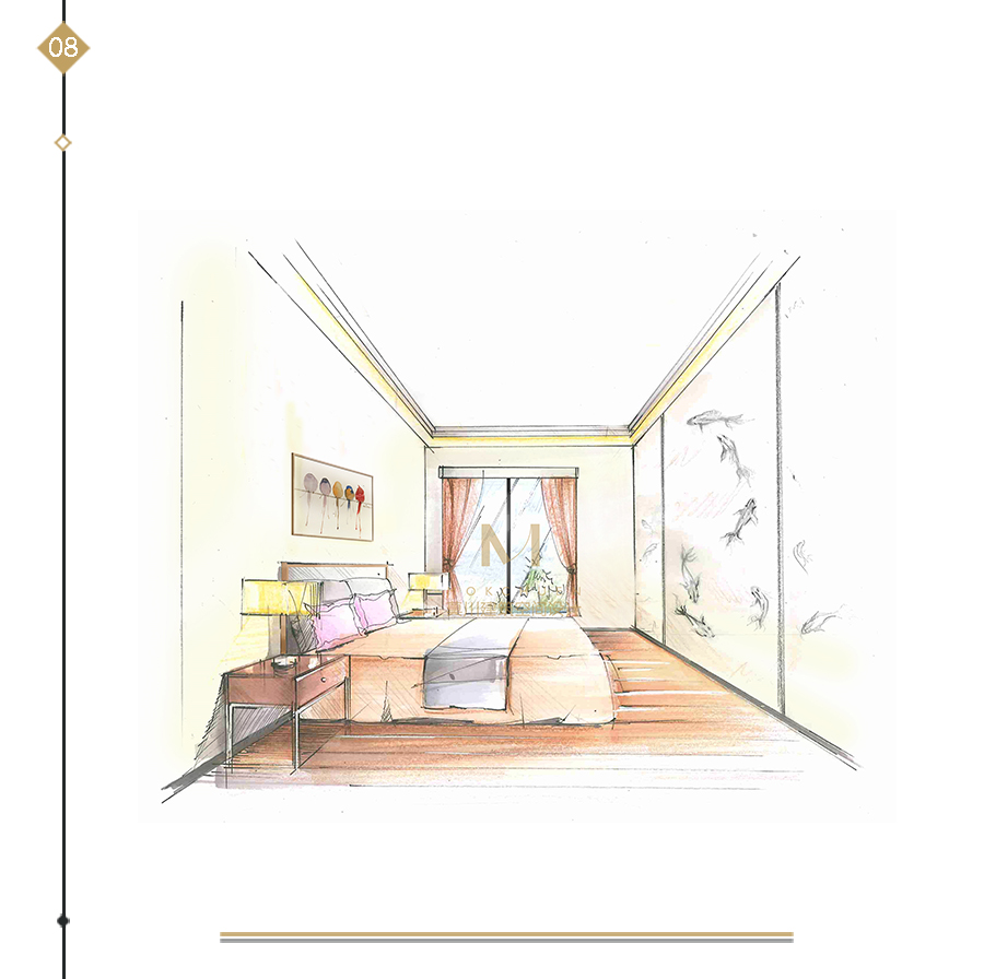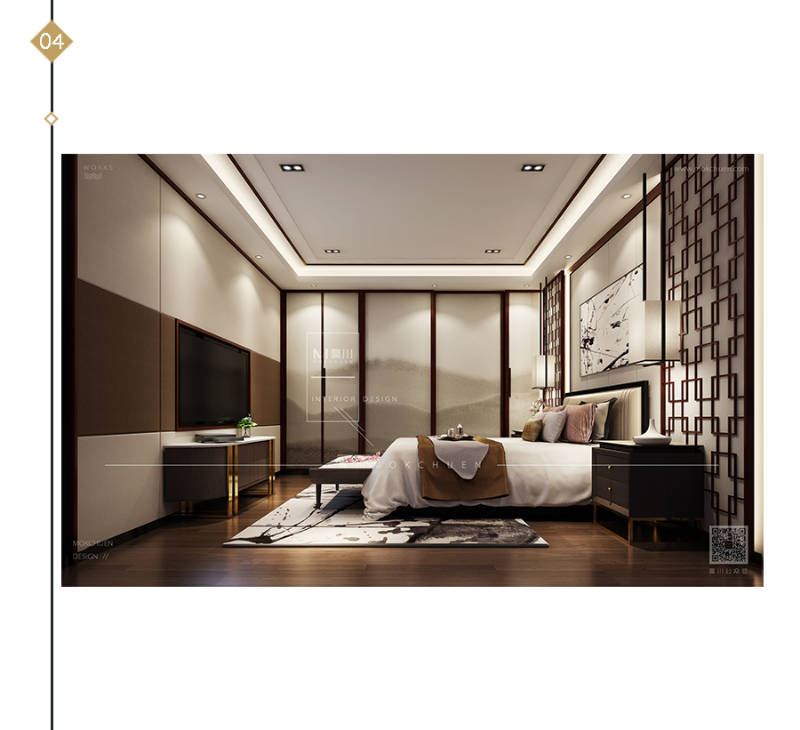 主臥區(qū)域以簡練的手法,床頭背景區(qū)域,將屏風(fēng)的概念和麻的材質(zhì)相結(jié)合,除去了傳統(tǒng)屏風(fēng)的繁瑣,體現(xiàn)出中式的素雅,現(xiàn)代的簡練,通往衣帽間的地方通過推拉門結(jié)合絹的布藝的形式,勾勒簡練的水墨丹青。