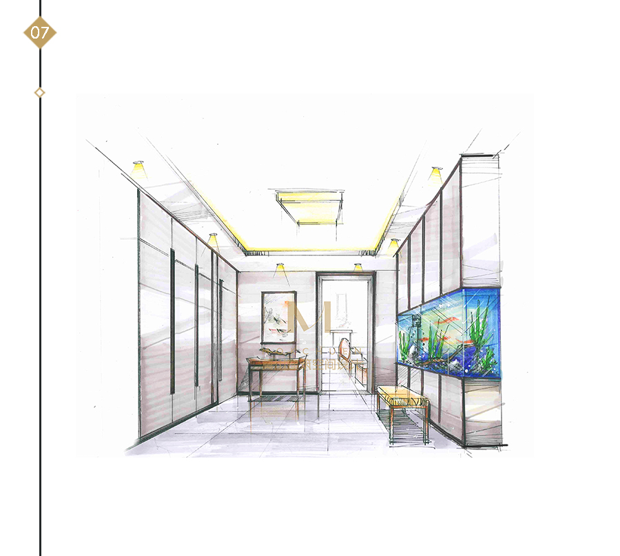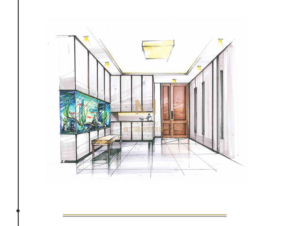 由于業(yè)主喜歡養(yǎng)魚,設(shè)計(jì)師在滿足儲(chǔ)物空間的同時(shí)還在玄關(guān)右側(cè)放置了魚缸,除開進(jìn)門的端景,為玄關(guān)增添了一道風(fēng)景線。魚缸上部用柜門加以修飾,以達(dá)到和鞋柜一體的整體效果。