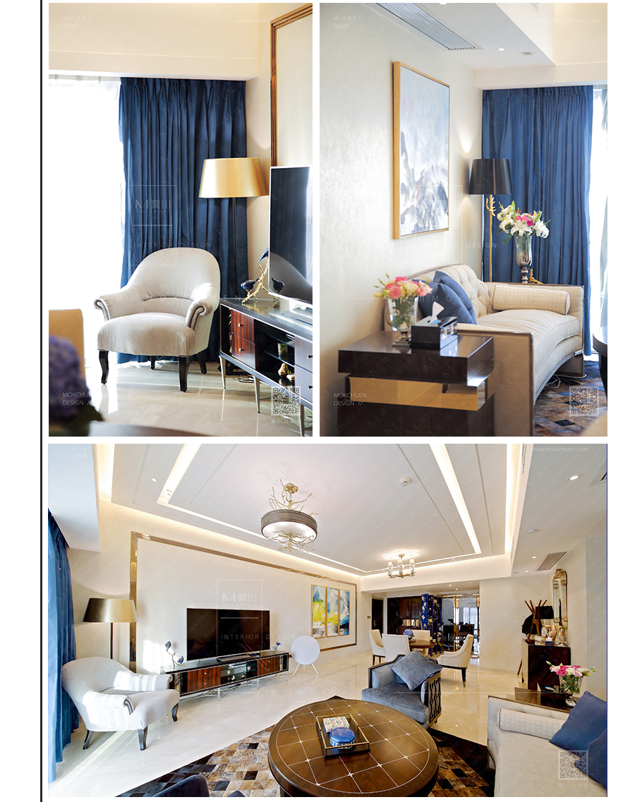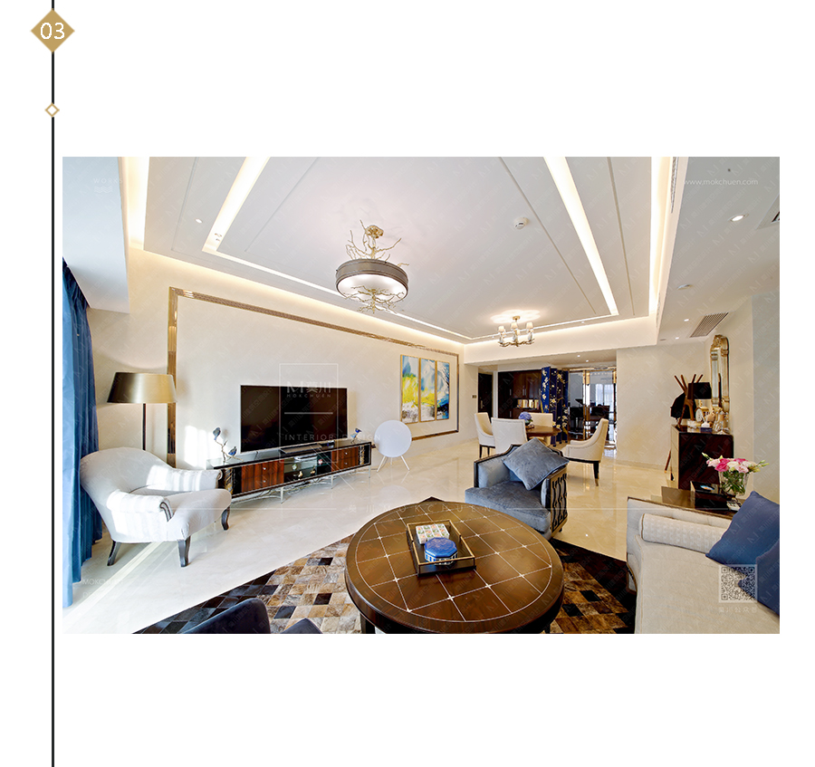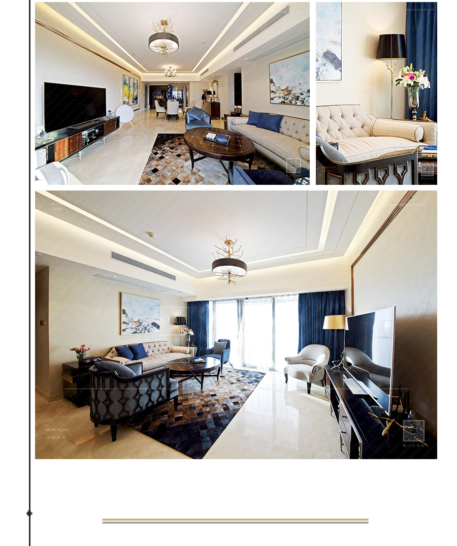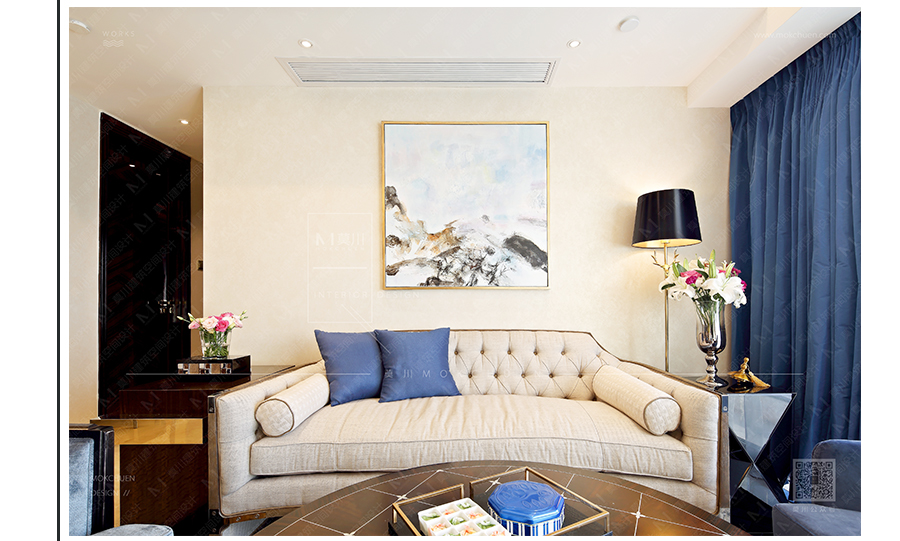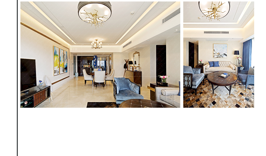 用玫瑰金線條做畫框形式用以裝飾,仿佛置身在畫中模樣。家俬為典型的新古典、后現(xiàn)代。仍然有“藍調(diào)”做為點綴。