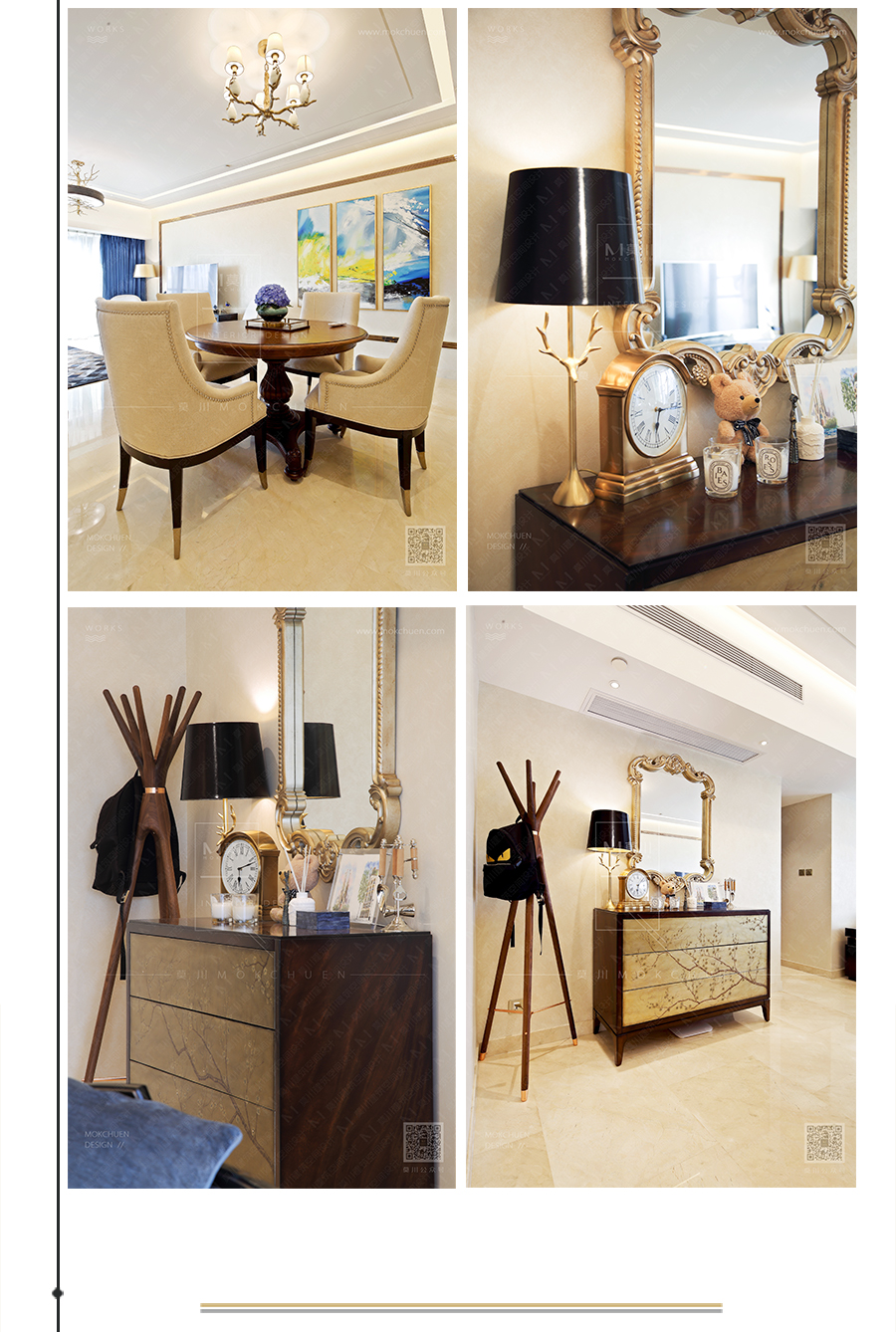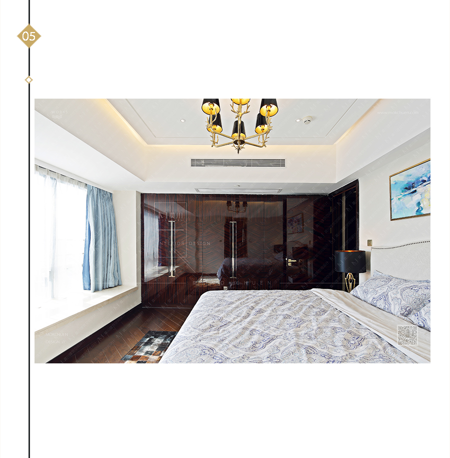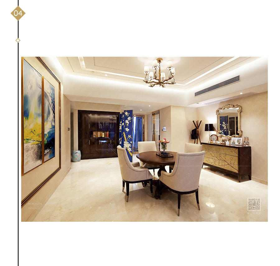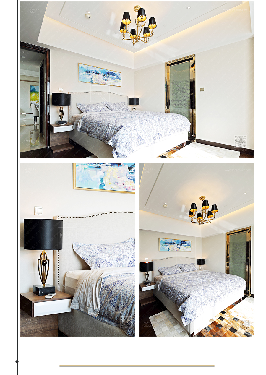 用玫瑰金線條做畫框形式用以裝飾,仿佛置身在畫中模樣。家俬為典型的新古典、后現(xiàn)代。仍然有“藍調(diào)”做為點綴。