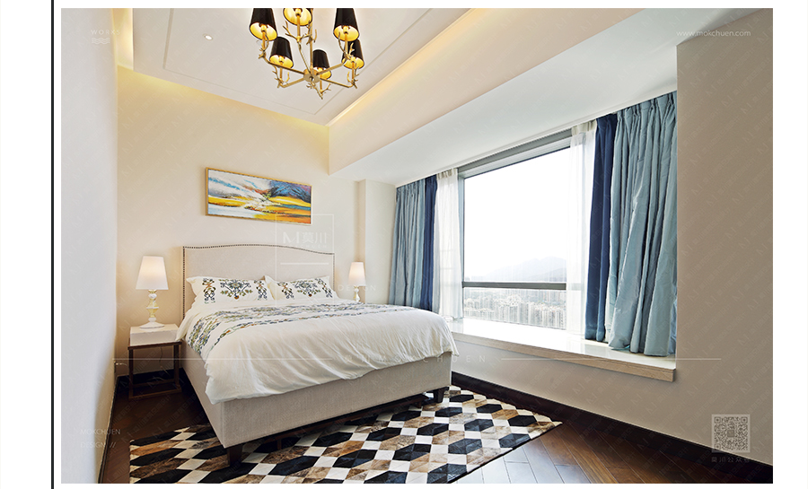 在自然光線下的空間更顯簡單干凈。掛畫、兩邊的床頭臺燈完美地避開了客臥不方正的缺點,又顯美感,兩全其美。