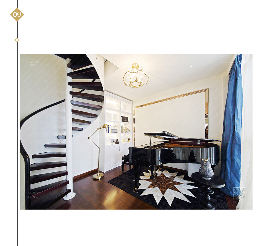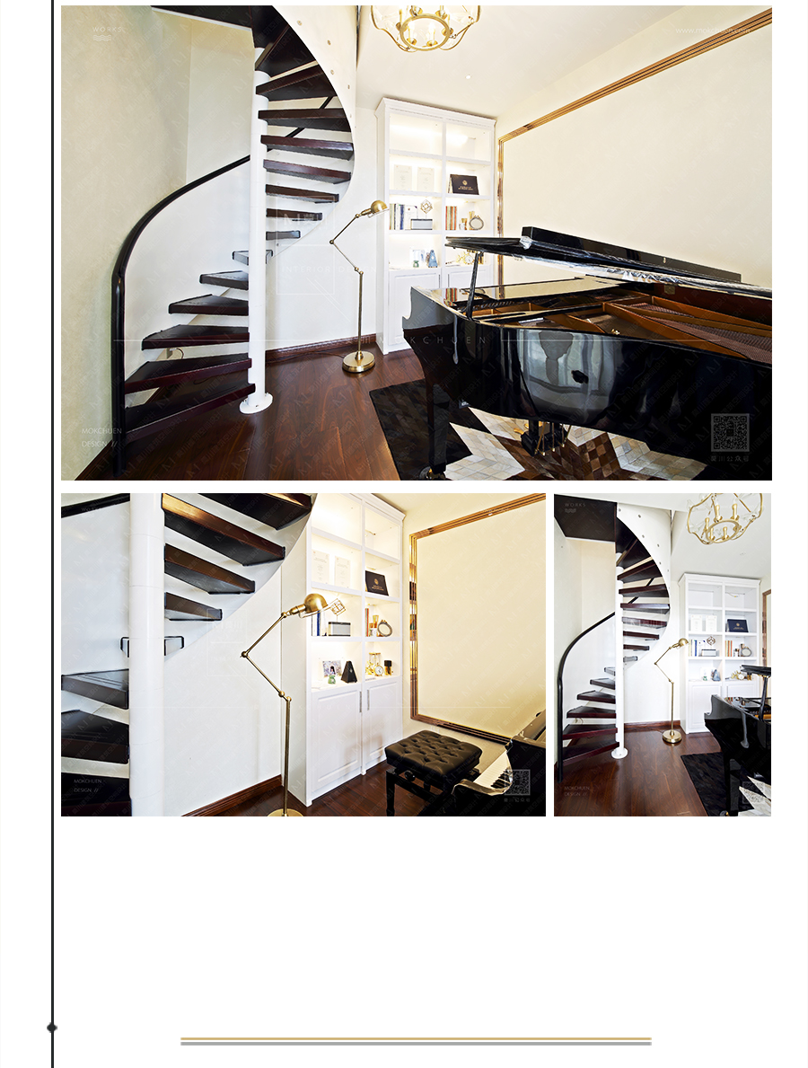 為了節(jié)省空間以及美觀考慮,采用旋轉(zhuǎn)樓梯,剛好鋼琴鍵為黑白,故樓梯的用色采用同樣的配色,將整個空間更好的融合、呼應。