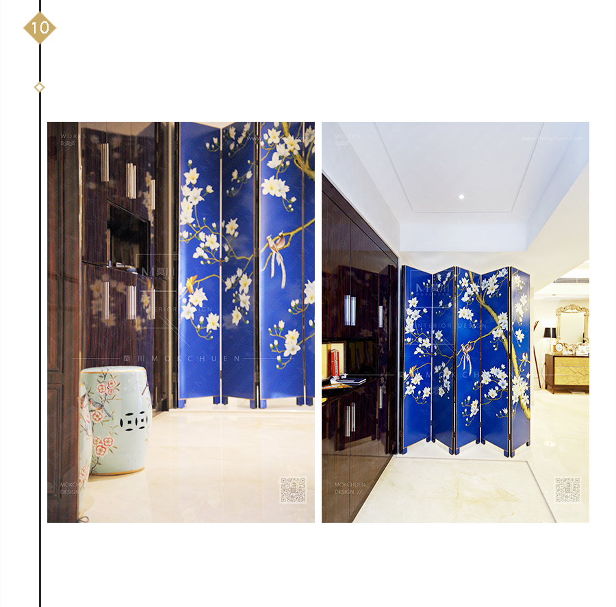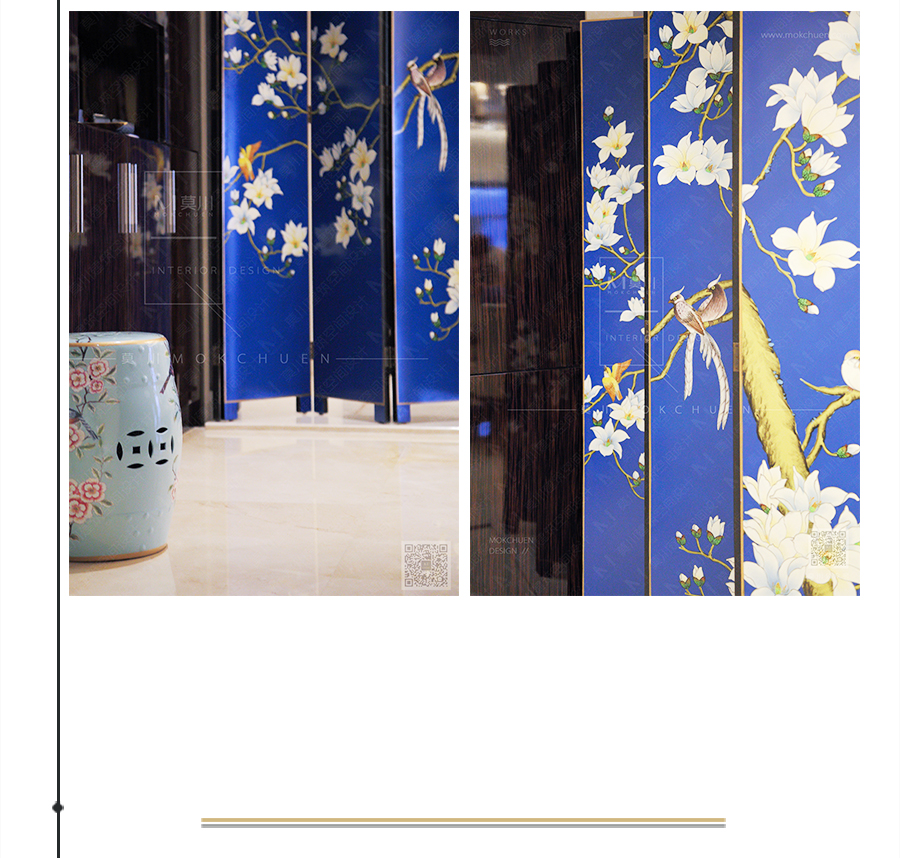 進門處的玄關屏風,第一眼便影射主題,手工繪制,有花、有鳥、有樹枝、古樸中透露著高貴、典雅。