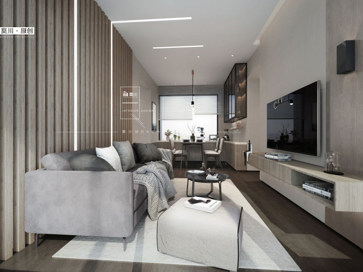 因為是小戶型,客餐廳是個不錯的選擇。原本寬度很窄,長度跟高度的尺寸過于突出, ,現(xiàn)在為了消除這種在沙發(fā)背景墻跟電視背景墻,于是采用木條格紋做飾面,完美滿足業(yè)主對木質(zhì)生活的需求!
