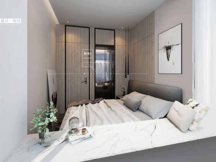 一面落地窗,一面全視玻璃,相立倚視,整體空間十分開闊,采光的力度也是超乎想象。- 臥室 -