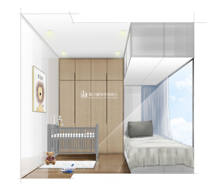 臥室也是采用乳膠漆和木質(zhì)飾面,軟裝也是低奢元素組成。而原有的儲物不能夠滿足業(yè)主的衣物儲置需求,于是在墻體上往次臥區(qū)域進(jìn)行推移,空出一個衣帽空間,讓一面墻體在視覺上錯落有致。墻面用木質(zhì)飾面來包裹,同時進(jìn)行轉(zhuǎn)角延伸,讓主臥整體大氣,小資氣息縈繞。- 兒童房 -