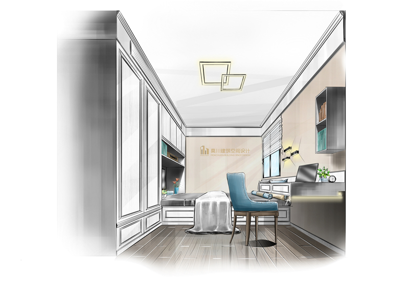 長輩房的柜體和榻榻米床一體化設(shè)計(jì)增加儲物把房間空間感更加舒適,床頭下方增加感應(yīng)式起夜燈,便于老人使用。主臥一整排衣柜設(shè)計(jì)大大滿足客戶衣物收納問題,飄窗改造成抽屜式梳妝臺,滿足女客戶需求即又不影響到原來空間的利用。