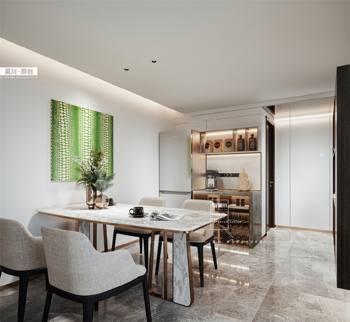 通過(guò)延綿轉(zhuǎn)圜的木作柜體過(guò)渡客餐廳空間。利用解構(gòu)分割手法重塑空間,勾勒墻體。