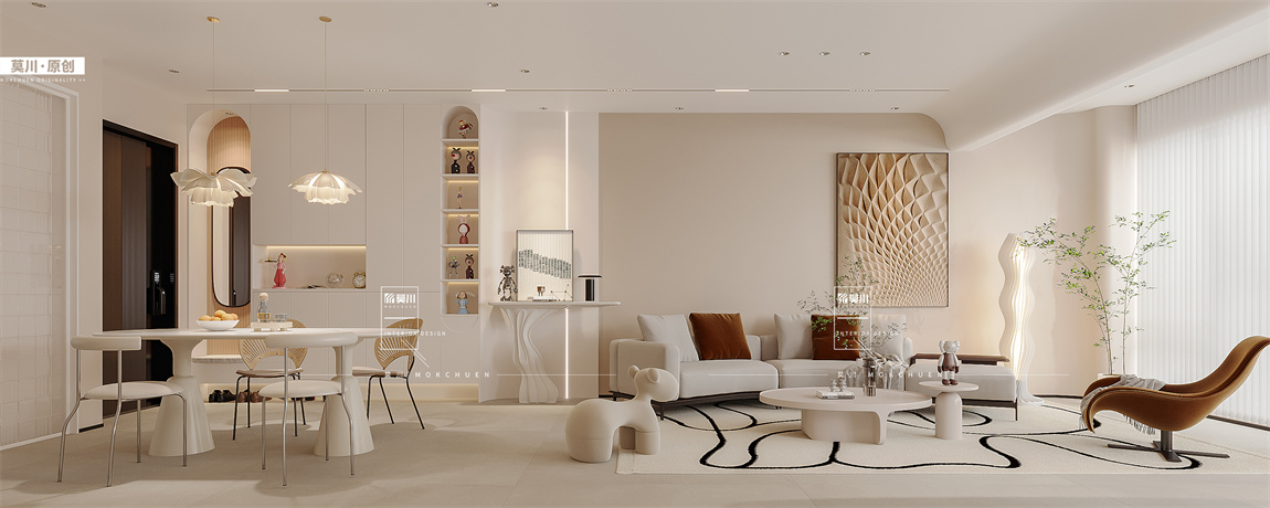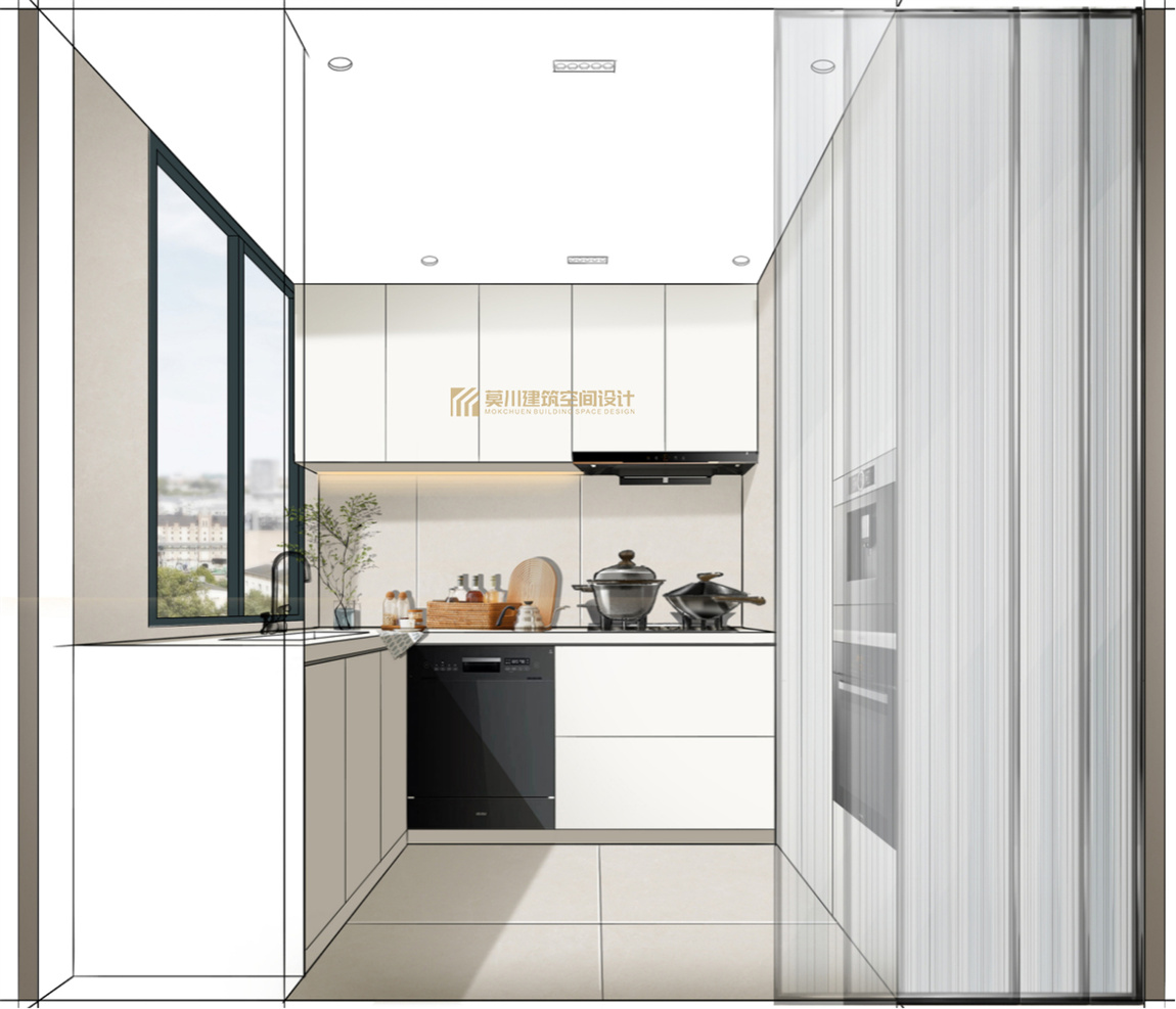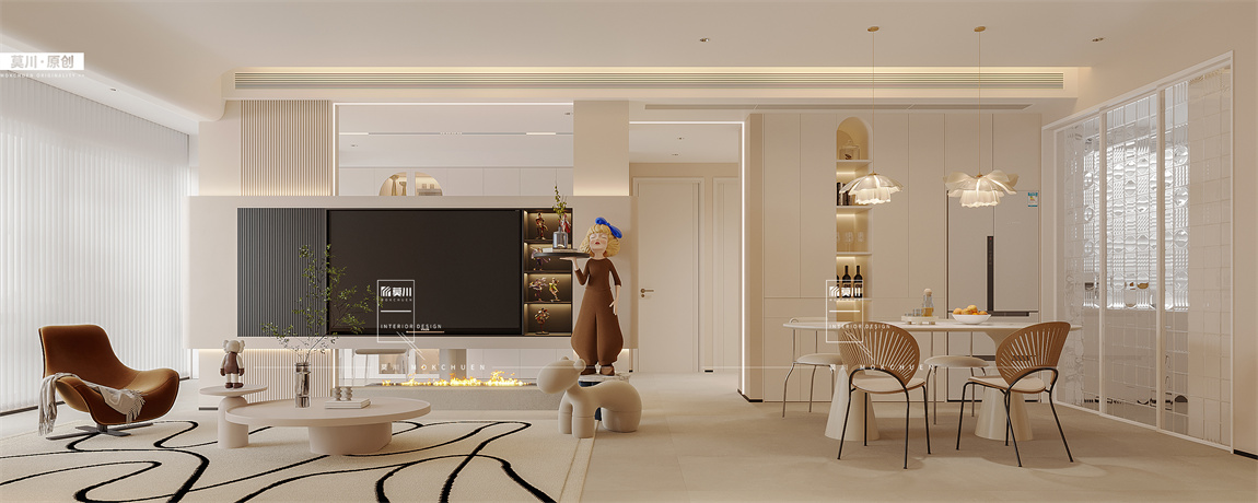 三連動重合式廚房空間彰顯客餐廳大空間的視覺效果,摒棄了深色 復(fù)雜的木飾面,,溫馨 有格調(diào)的色調(diào)基底, 營造了溫暖明亮的氛圍。