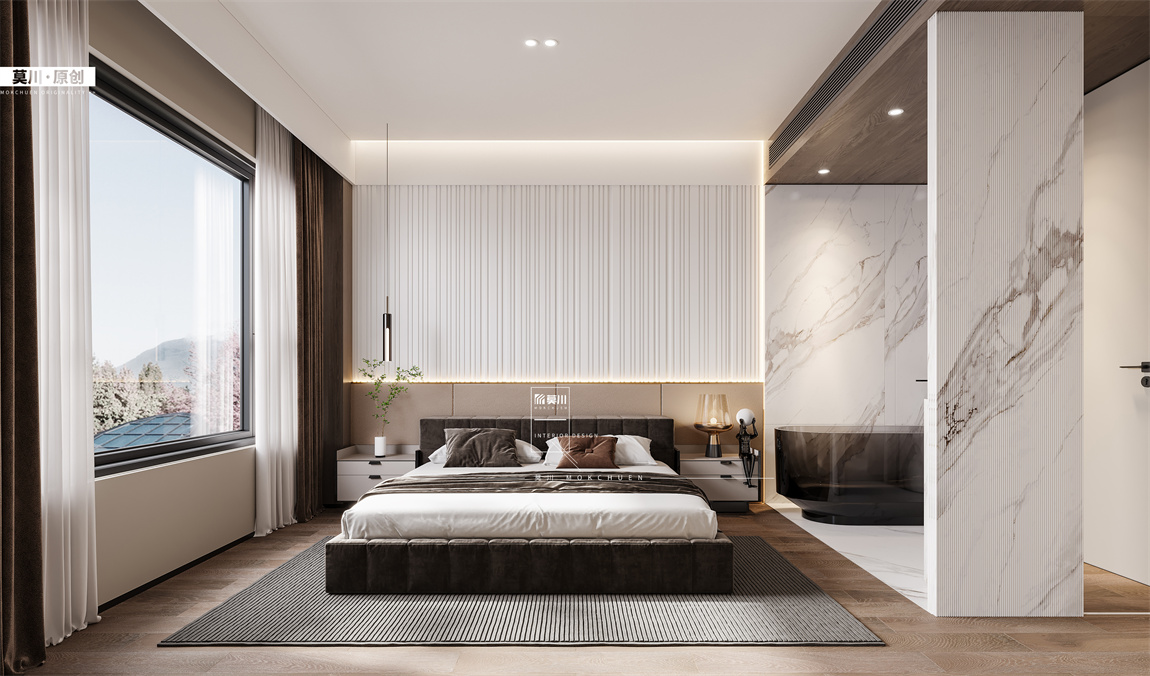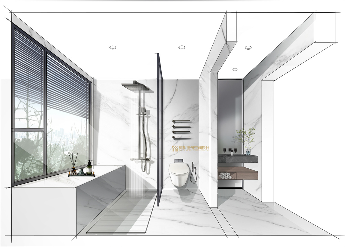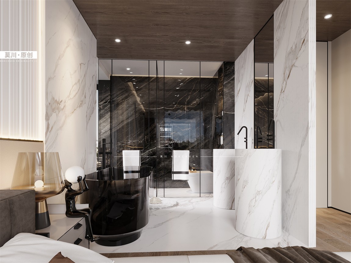 廚房打開變成了開放式,餐廚一體,一開門空間感就很大,公共空間形成整體。主臥做成了豪華套間,原始衛(wèi)生間小,但是客戶想要浴缸,所以另辟蹊徑,將衛(wèi)生間做成半開敞式,淋浴房和馬桶間用霧化玻璃隔起來,泡澡區(qū)和洗手盆做成開放區(qū),讓主臥的視覺延伸性更好.