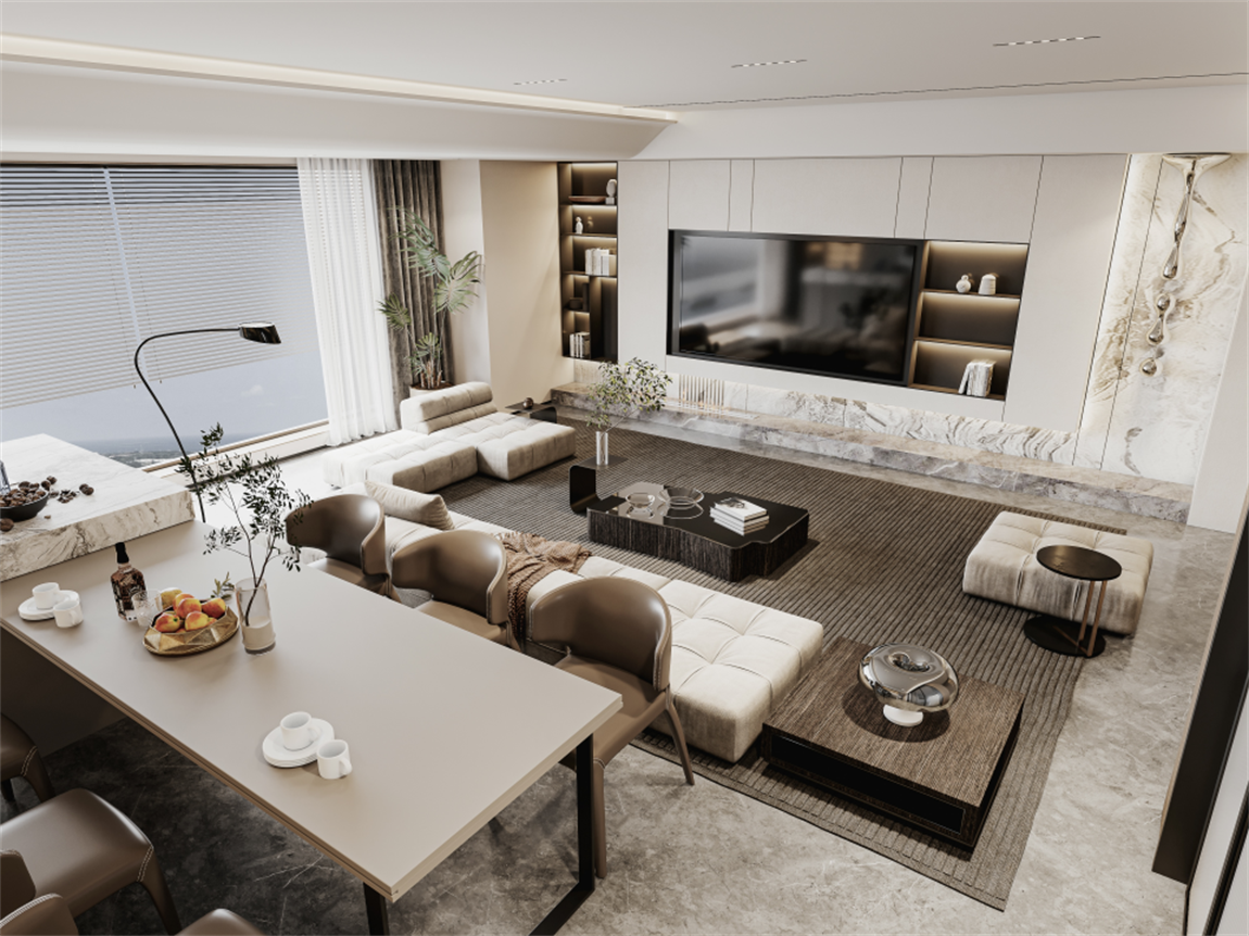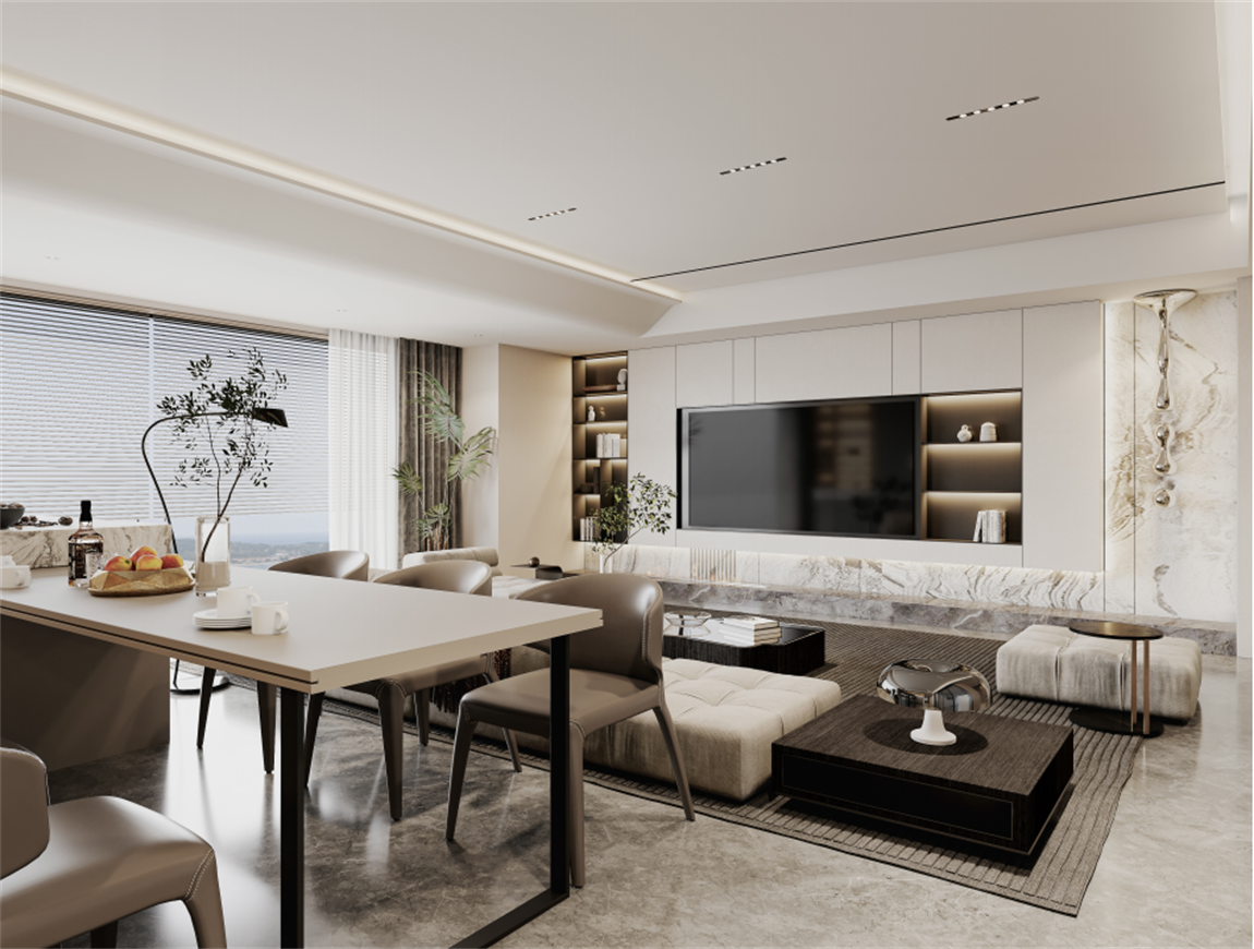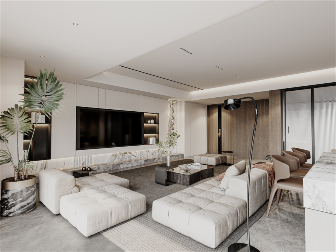 ①客餐廳陽臺梁位的處理,采用了弧形天花的包邊,讓原本凸角的梁位得到了一個修飾,更加的美觀和整體。