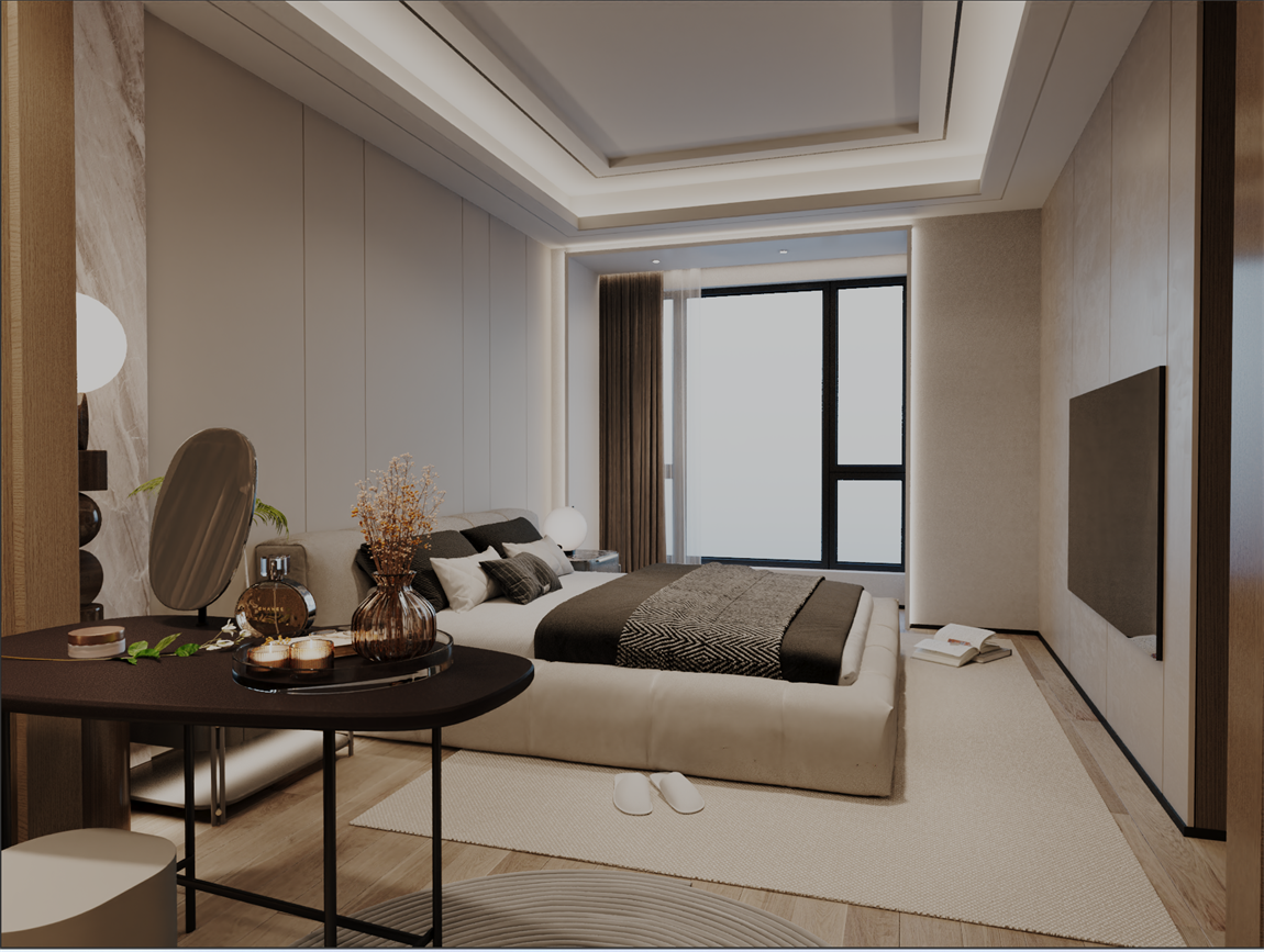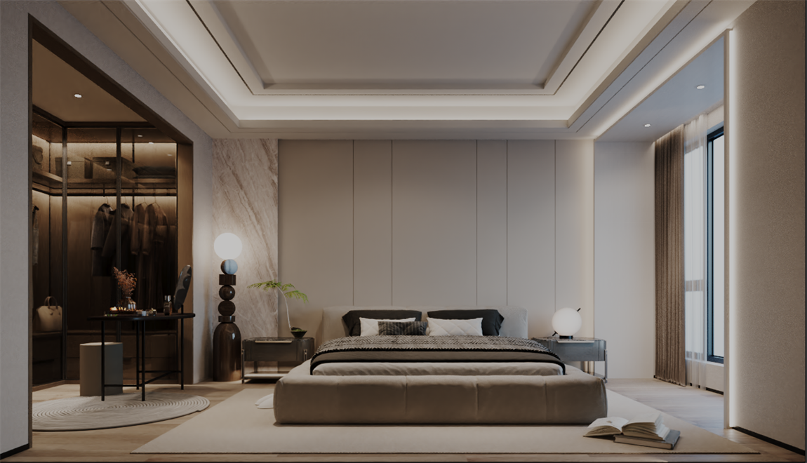 ③主臥飄窗的位置墻體與天花都采用了木飾面與燈帶的相結(jié)合,形成一個大氣高端的門廊與左邊衣帽間的門洞相互對應(yīng)。