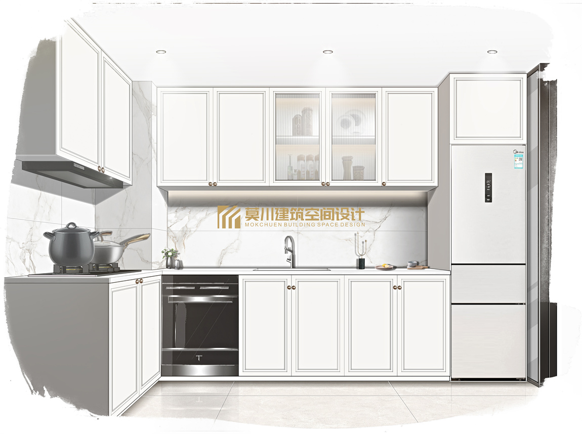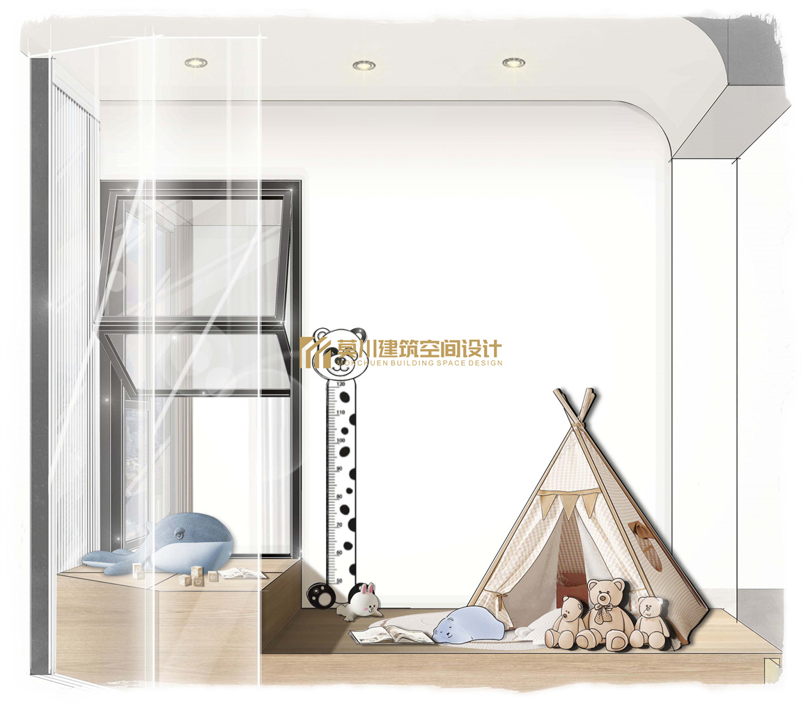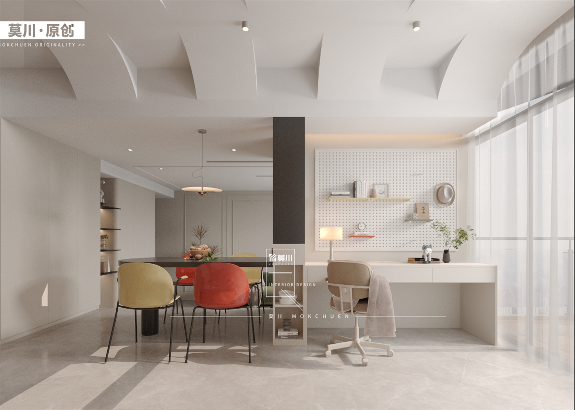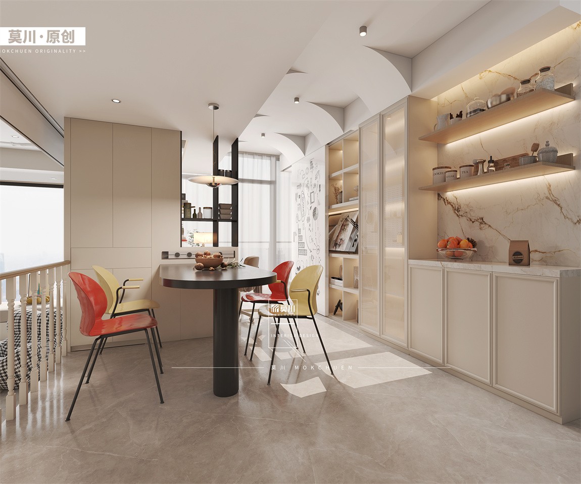 通過重新劃分建筑跌級位置,擴(kuò)大餐廳活動區(qū)域,在法式元素基礎(chǔ)上增加裝飾柜,營造出有趣味性的成長環(huán)境