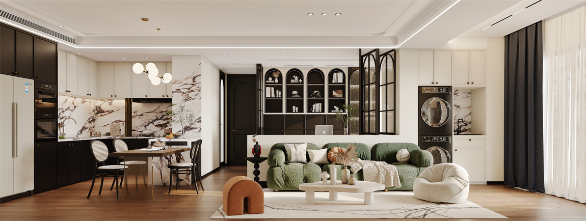 入戶玄關(guān)結(jié)合餐廚一體化設(shè)計,增加了空間尺度感,藝術(shù)感。