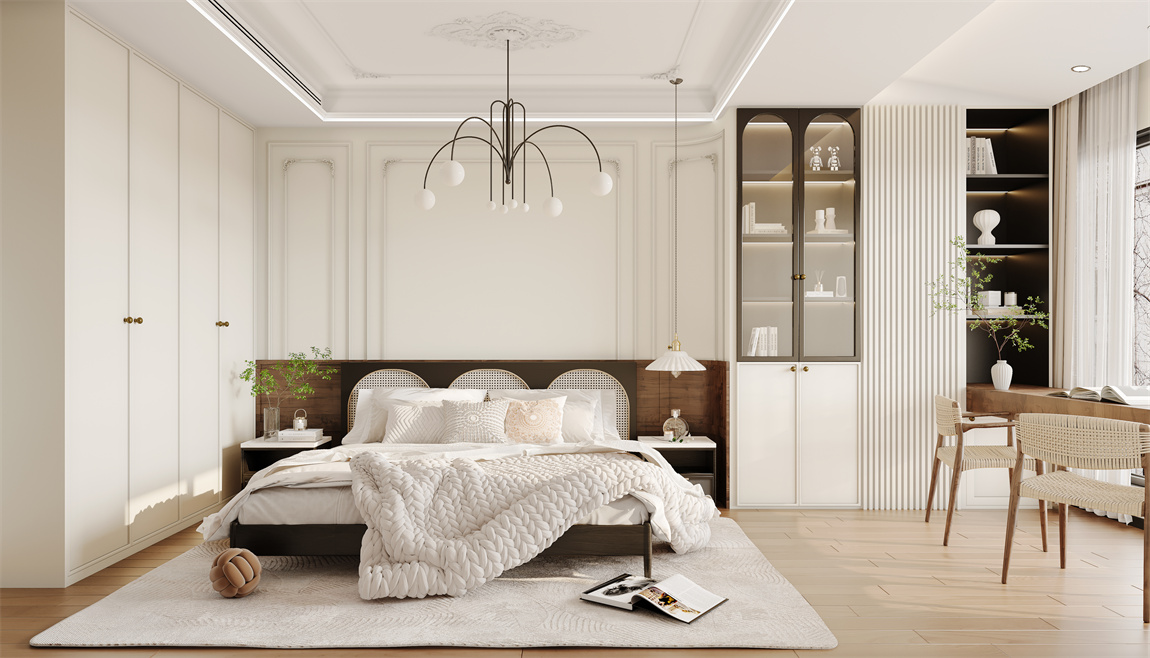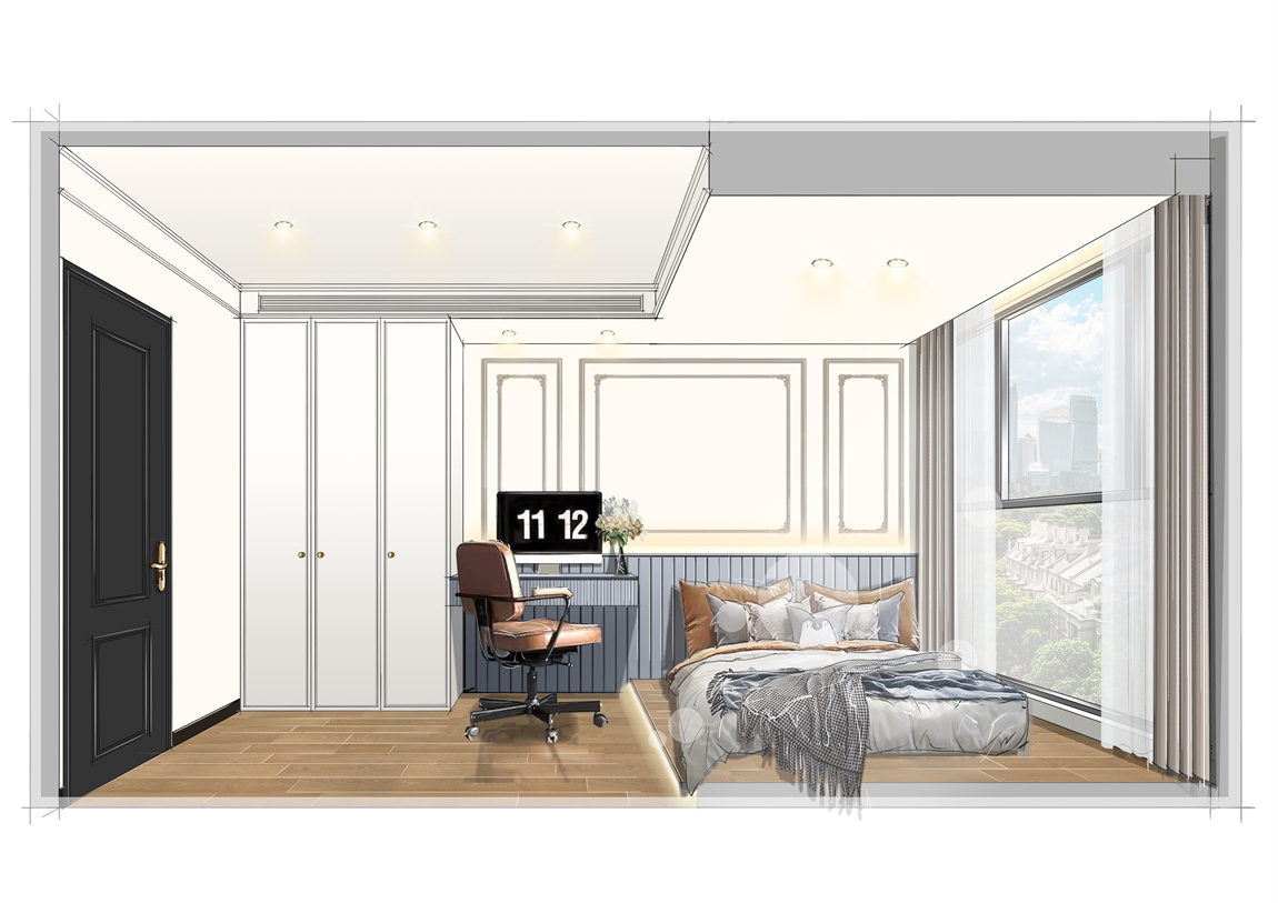 書房做半開放式,結(jié)合客房為一體的多功能空間,可開可合,開可與客廳形成空間聯(lián)動,增加客廳空間感,整體空間大氣開闊。