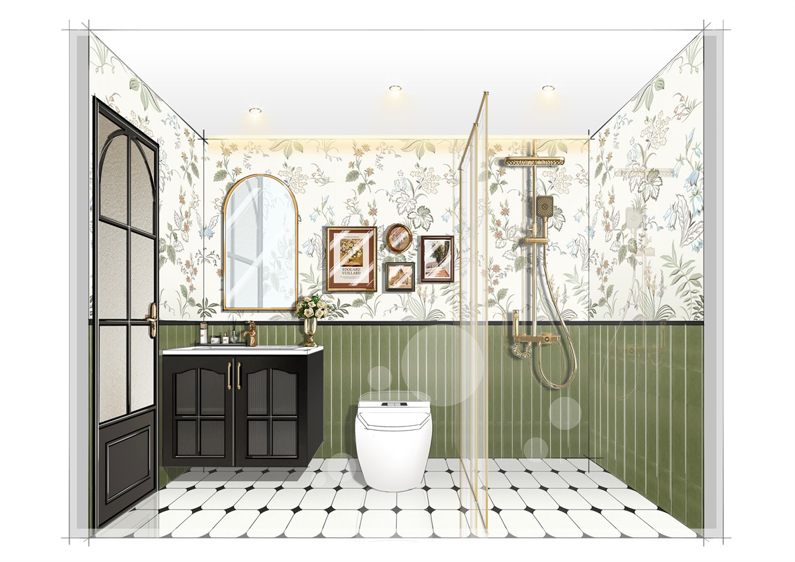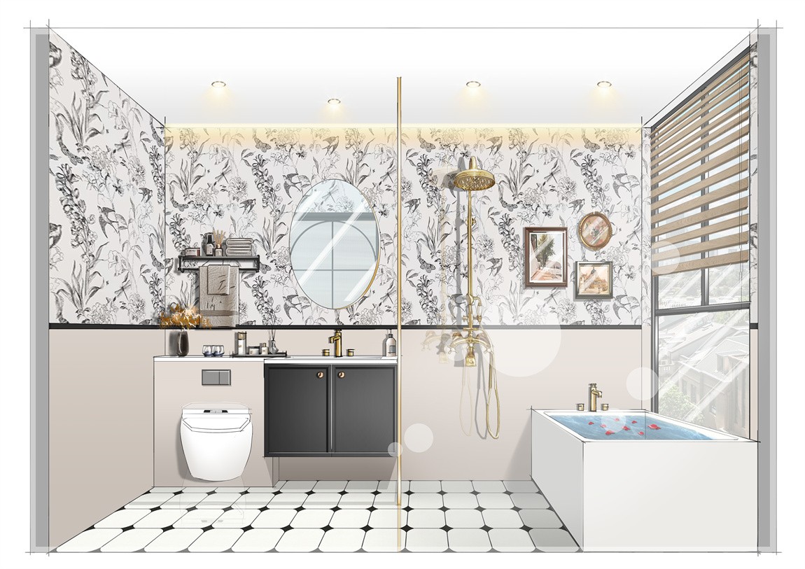 衛(wèi)生間重組,洗漱區(qū)、方便區(qū)、淋浴區(qū)沿墻面一字排開,充分利用每一寸空間。
