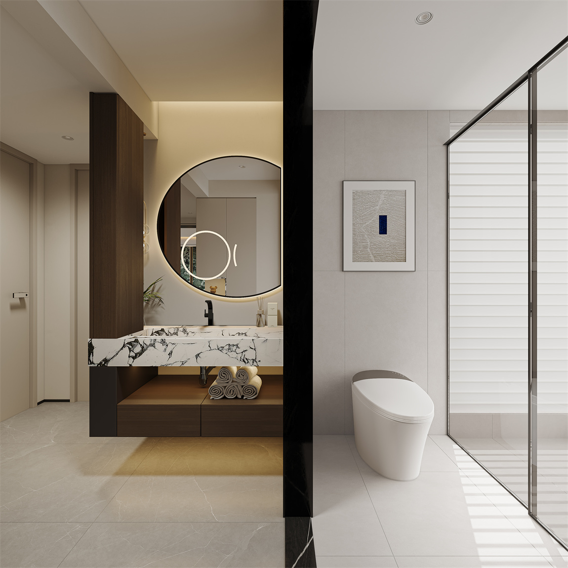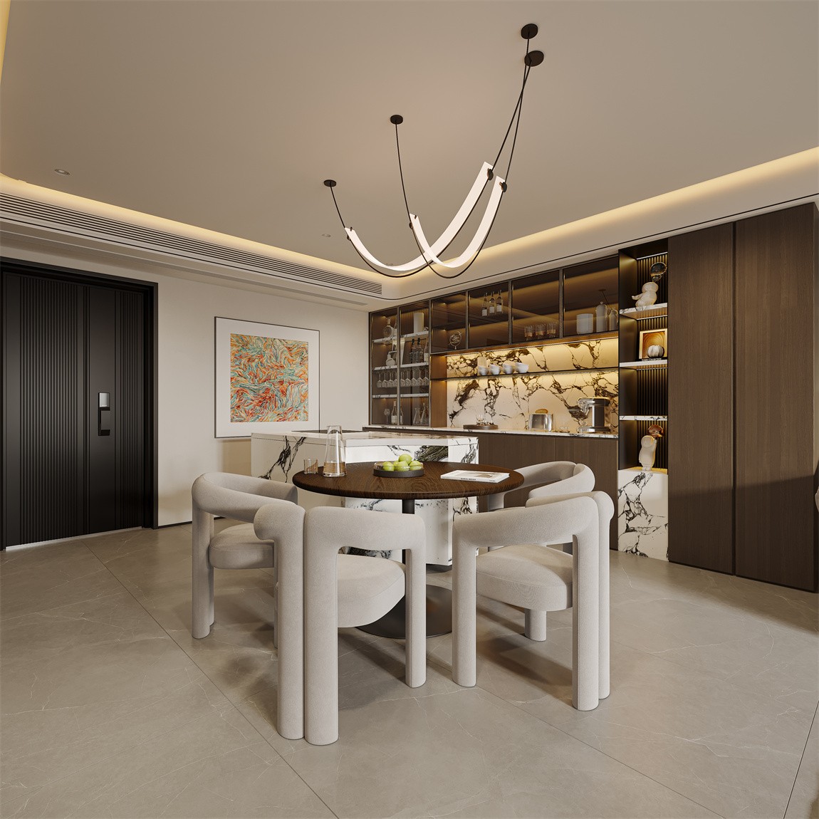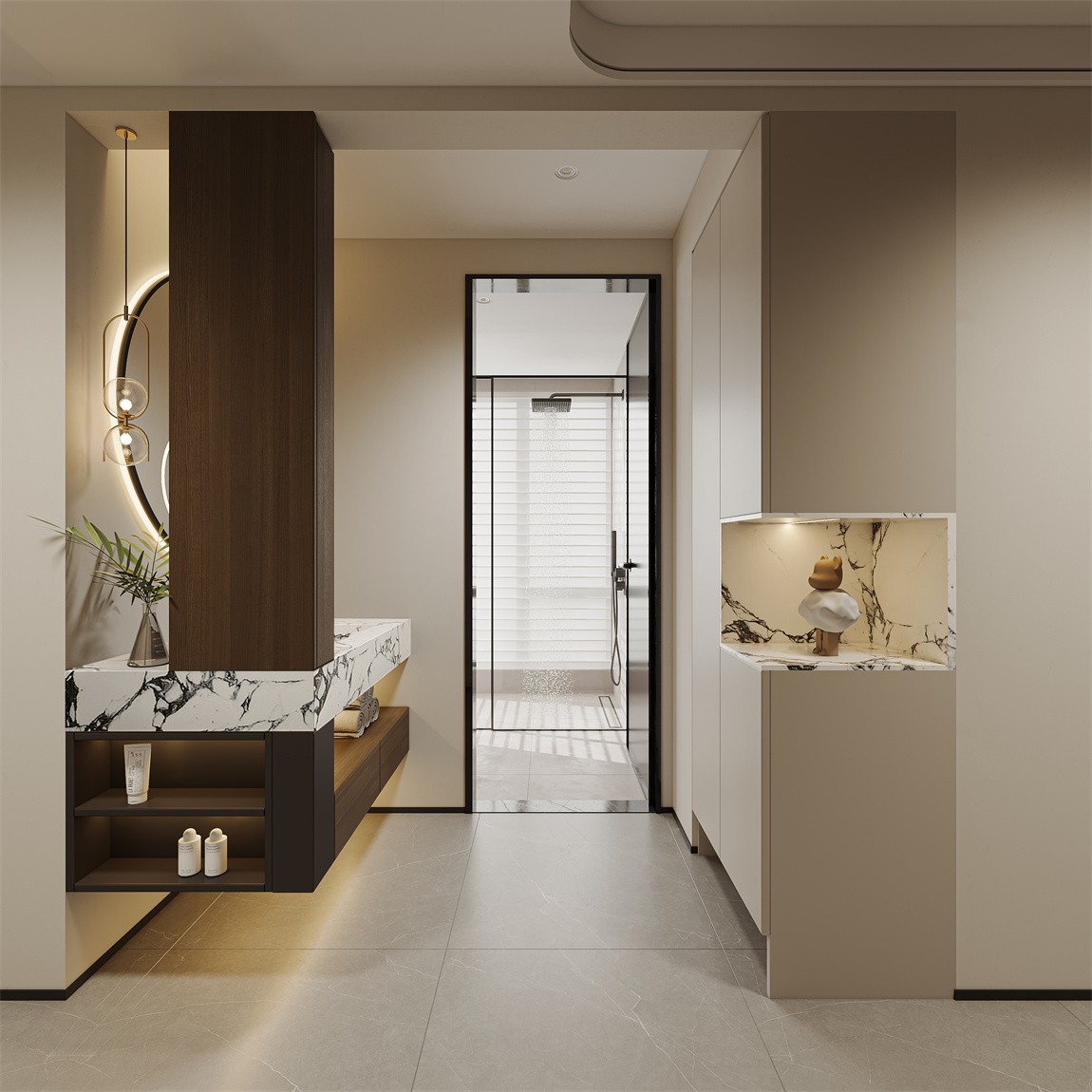 設計亮點:圓桌和吧臺的結合,更實用且造型獨特,石材的大量應用增加空間的品質感,開放式公衛(wèi)干區(qū)結合走廊造型,讓走廊的整體空間更有品質感和個性的造型。