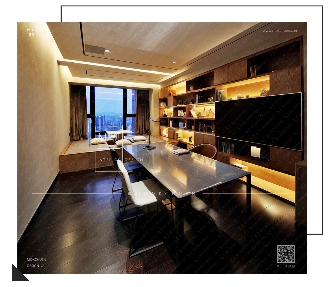 沿墻設(shè)計(jì)的書(shū)柜,合理分區(qū)的大小柜格,黑鋼鏡面的推拉門(mén),增加了一個(gè)隱秘的儲(chǔ)藏空間。加上榻榻米的設(shè)計(jì),正所謂“勞逸結(jié)合“。