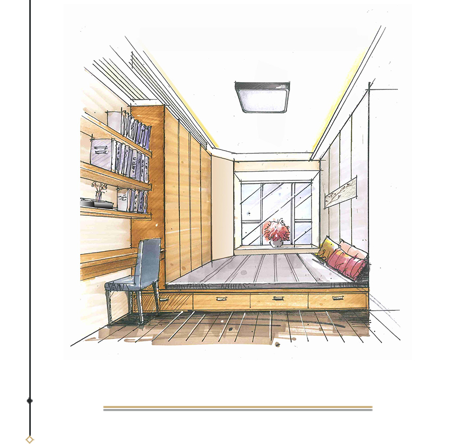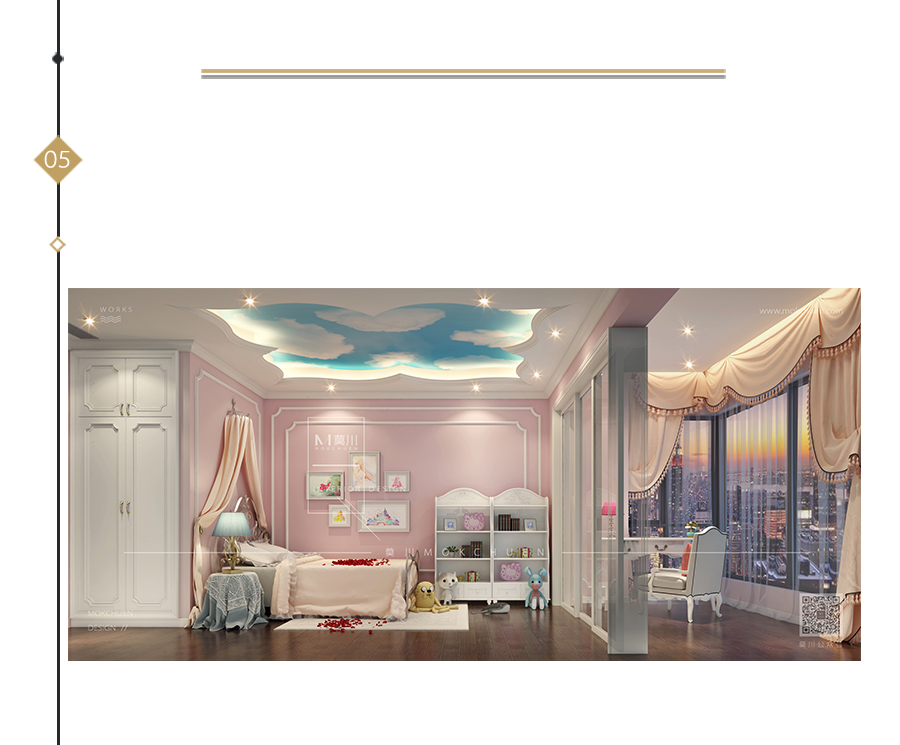 為了使得開放式書房有種無形的框架圍繞也豐富該區(qū)域,所以特意設(shè)計了水墨畫意境的云海畫面。