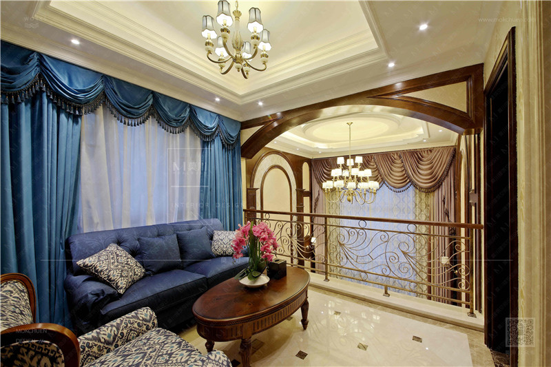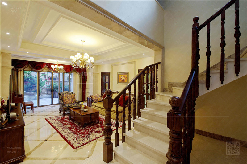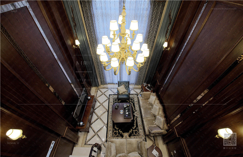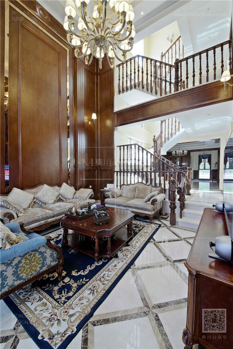 六米層高的客廳墻面全實木貼面,大理石為鋪,演繹別樣低調(diào)奢華。