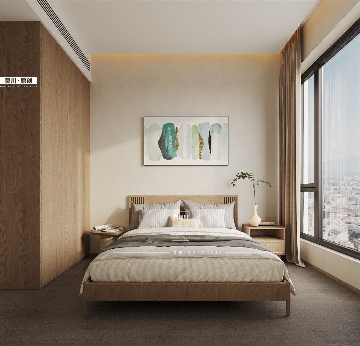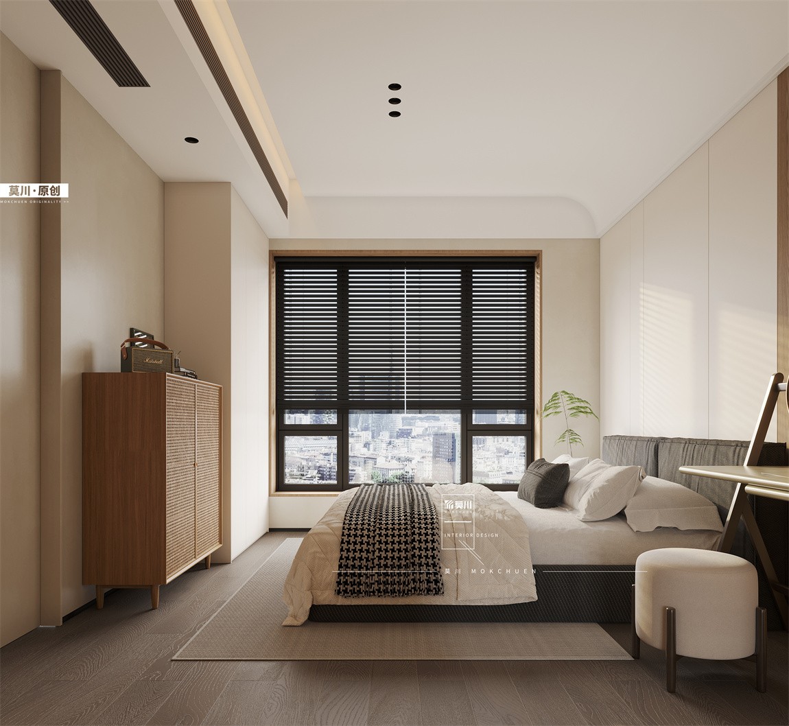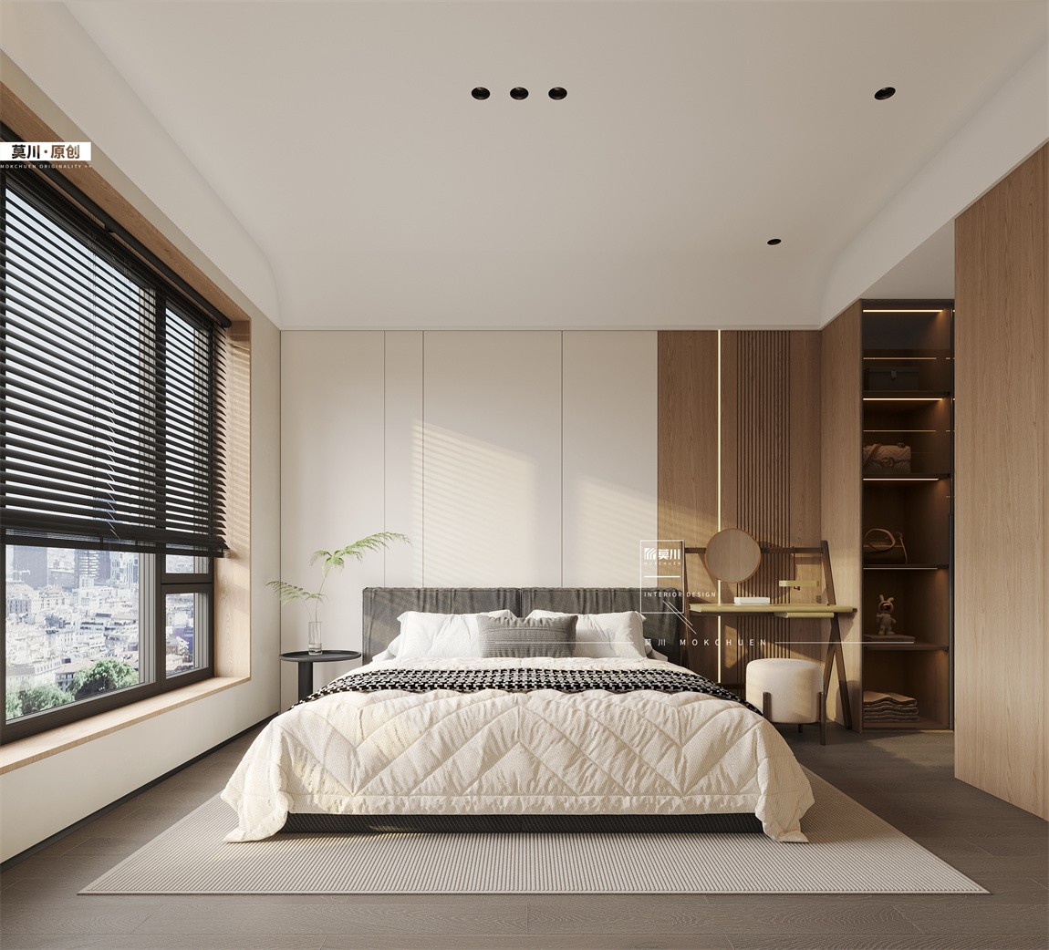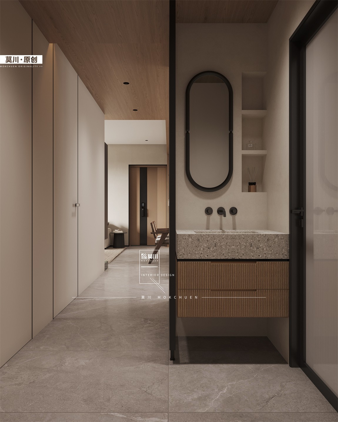 本案為臺式風(fēng)格,采用比較多的木質(zhì)材料,整體溫馨有格調(diào)又不失高級感,過道盡頭的門正對入戶門,所以過道的門做的是和護(hù)墻板一樣材質(zhì)的隱形門。