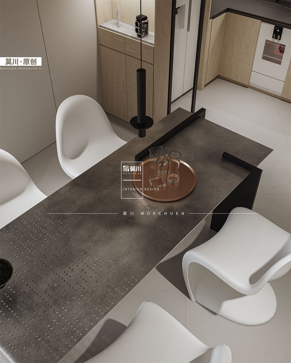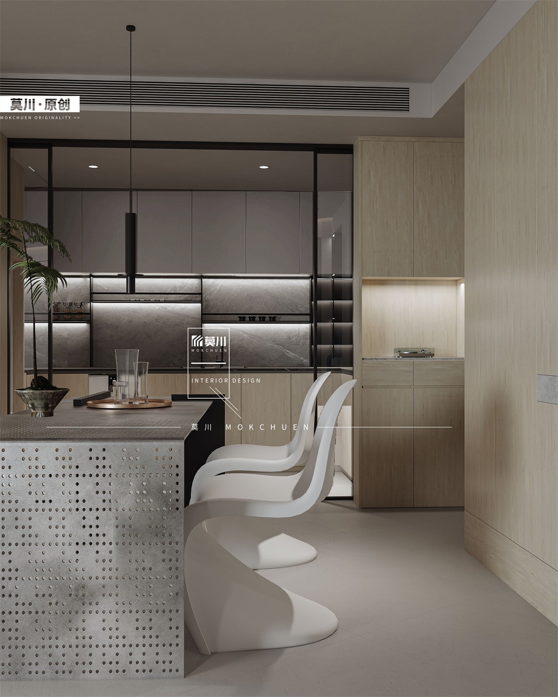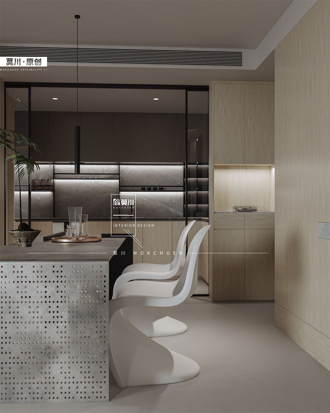 整個(gè)空間布局重新擴(kuò)大,半開放廚房空間與餐廳融為一體,增加主臥空間,增加衣帽間空間