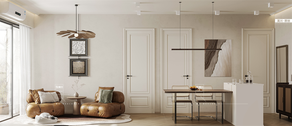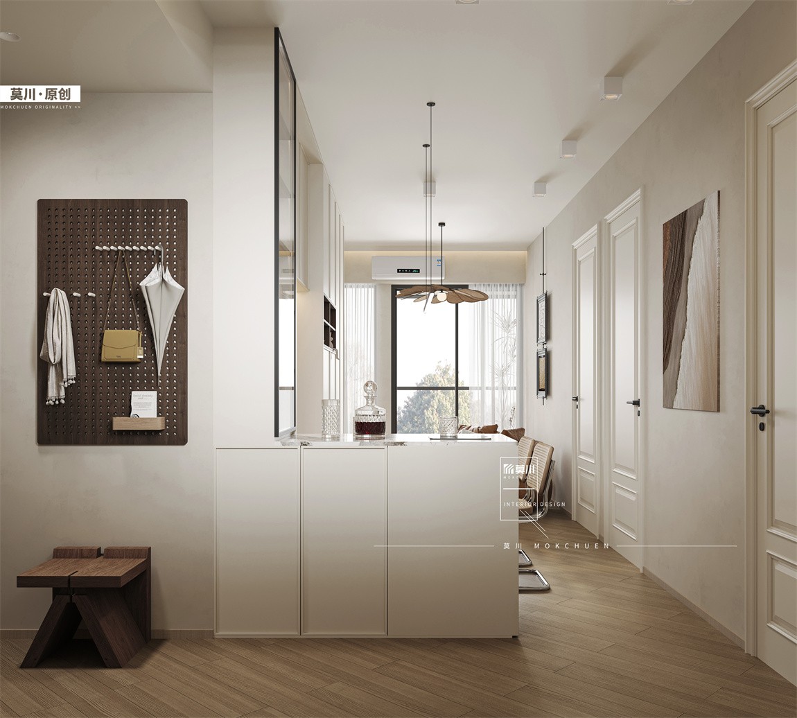 將現(xiàn)場原有的房門進行更換,增加風格上的設計元素,同時不會影響空間感.