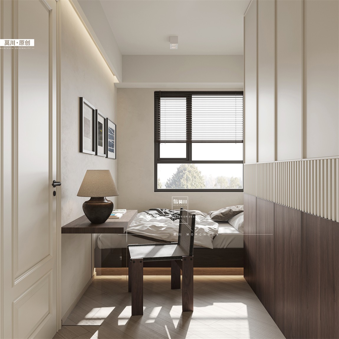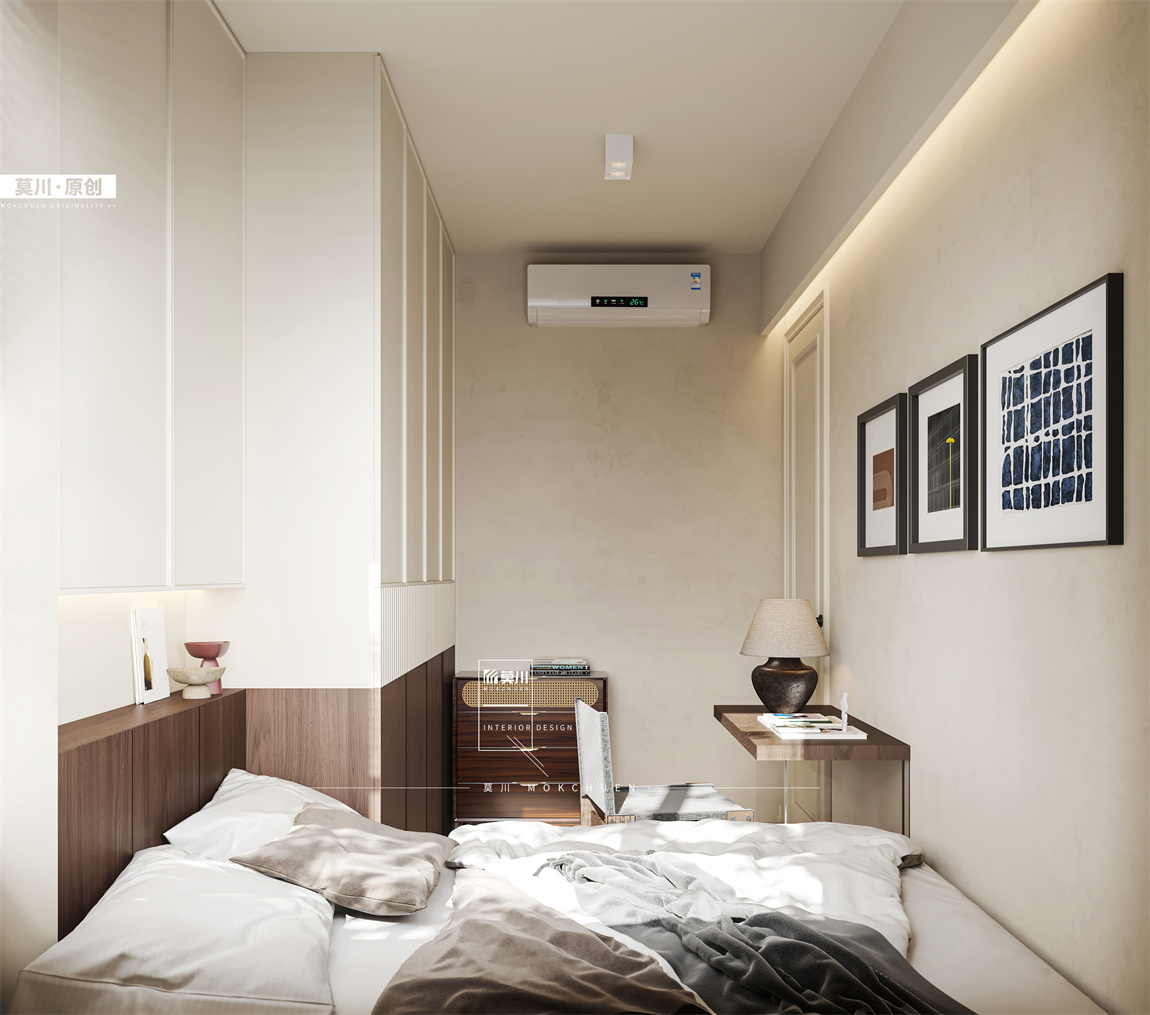 主臥室有不同高低的梁,通過梁底的燈槽設計,一方面弱化梁位,一方面增加燈光氛圍.