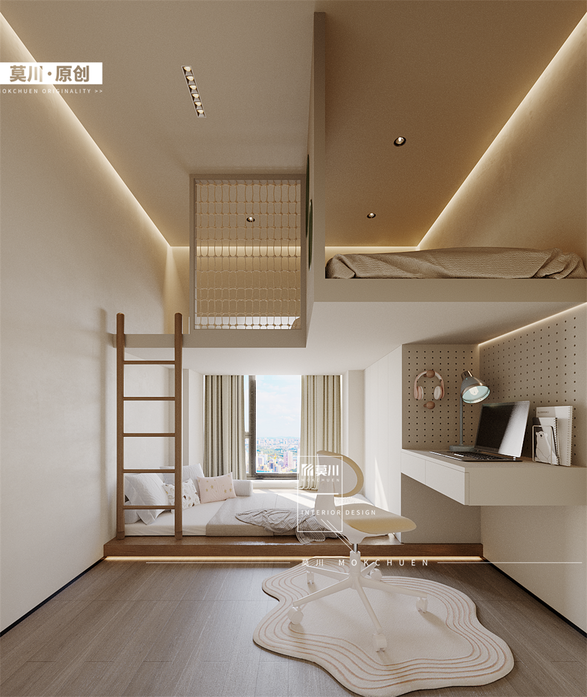 開放式廚房 利用生活陽臺做餐廚一體區(qū)域 多了吧臺簡餐功能區(qū) 公衛(wèi)利用過道 做了三分離 滿足多口人的洗漱問題 孩子房做上下床形式 滿足三孩居住需求 女孩房地臺利用上凸窗面積 增加睡眠 活動區(qū)域