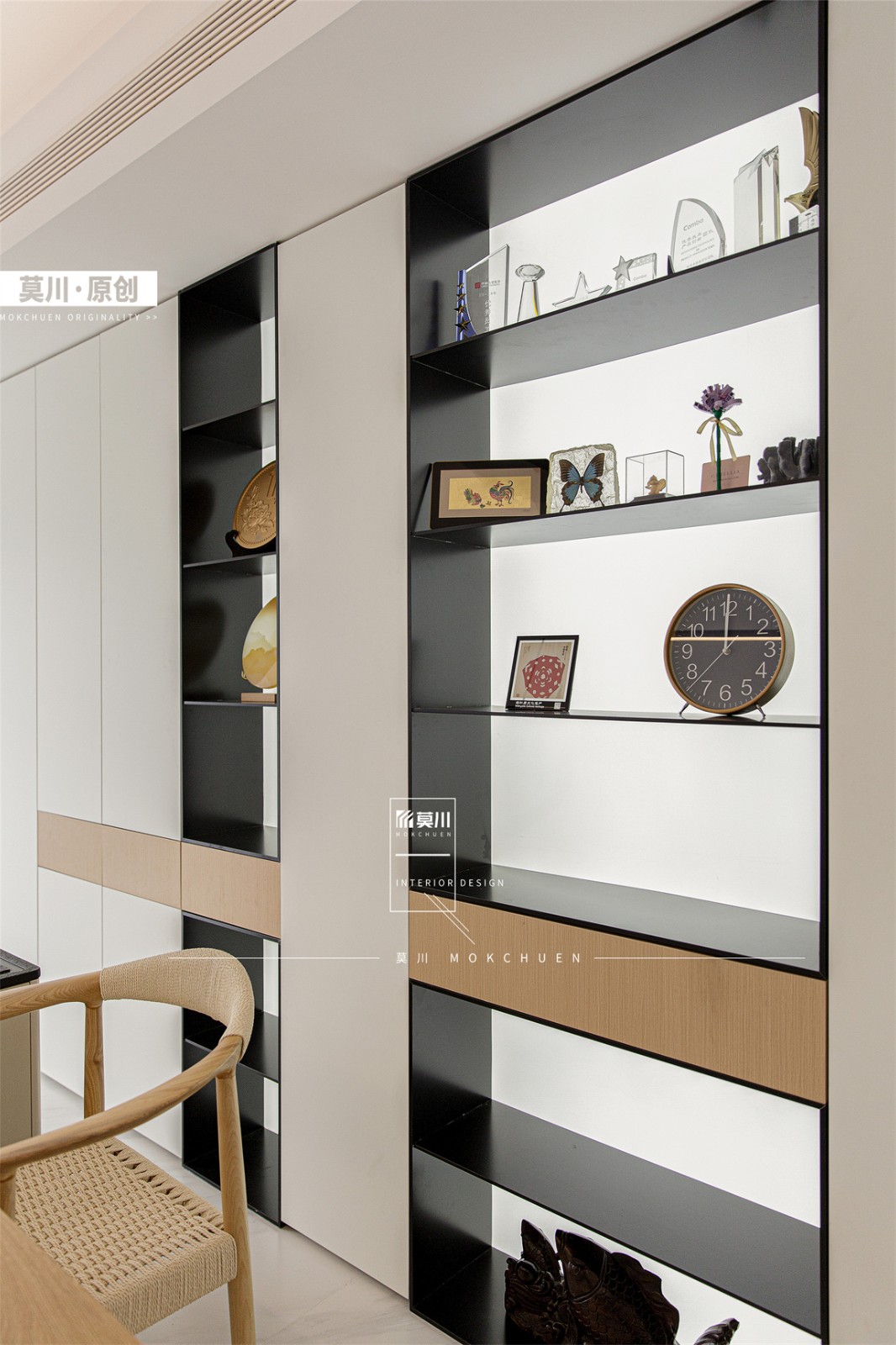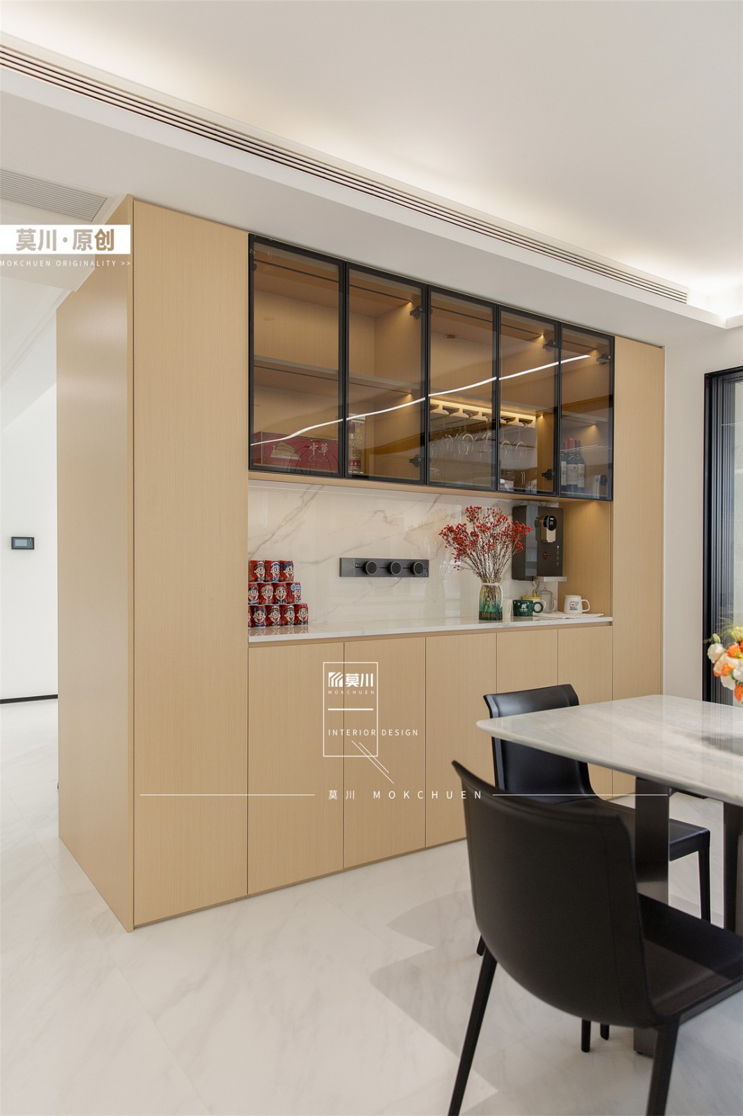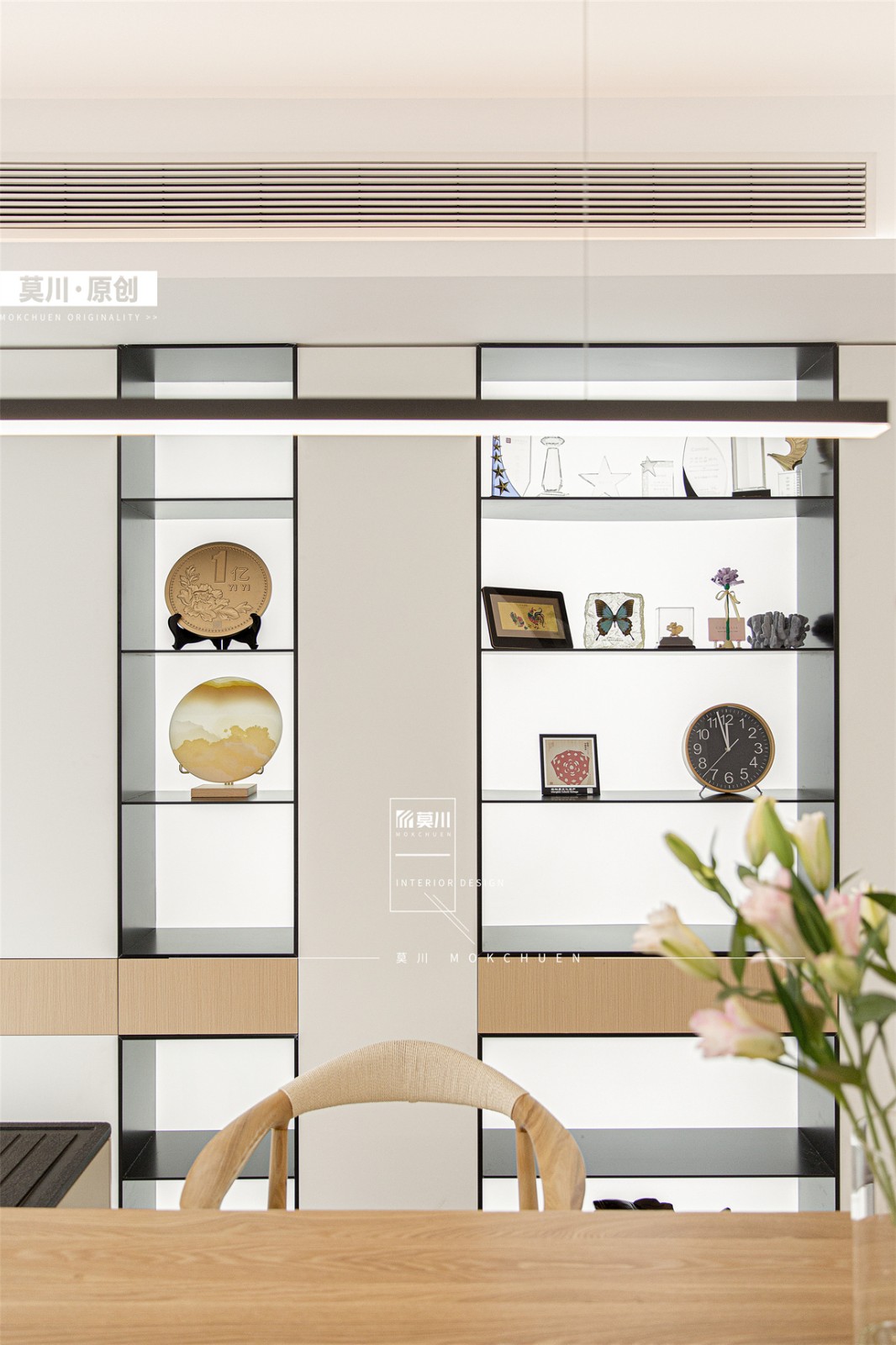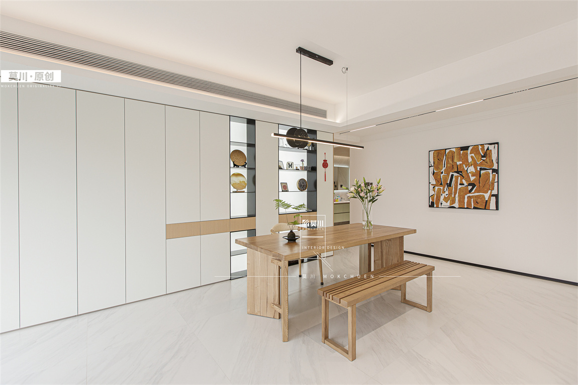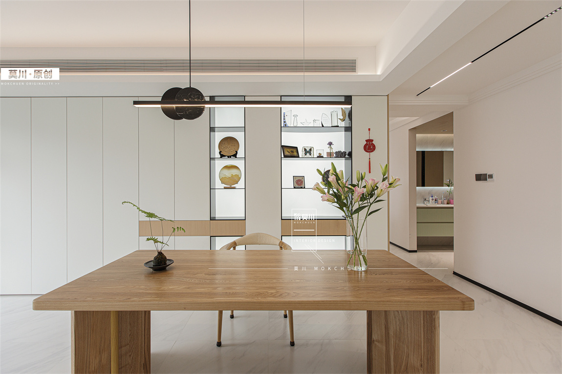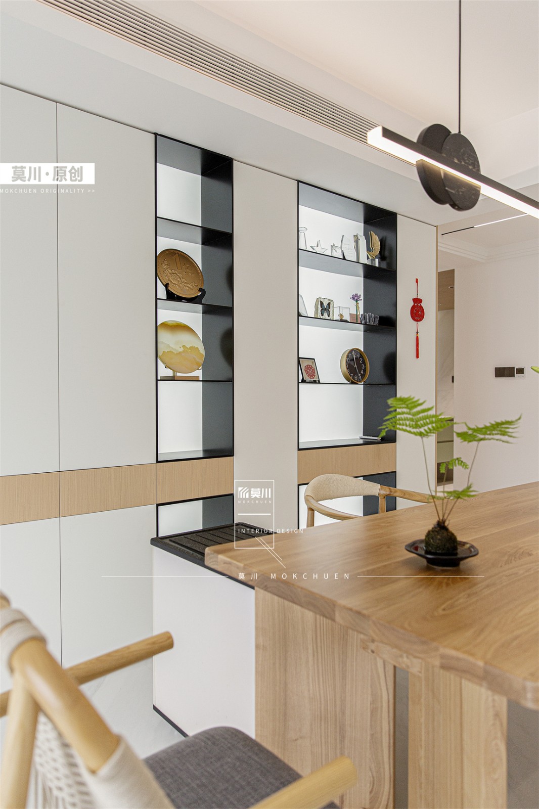 整體空間以柔和的木色簡約的白色為基調,溫暖又有自然的質感,詮釋了家的溫度。茶室寧靜素雅開放格的透光板增加燈光的層次也更好展示收藏,一幅靚麗的掛畫增加空間活力將視線引入過道走到客廳??蛷d餐邊柜木色與小朋友活動區(qū)整體木色增加空間的自然與溫馨感,柜體下面開放格方便小朋友玩具收納,對面的黑板漆特別選擇成了與木色同色的漆面而非常規(guī)的黑色。媽媽懷抱椅舒適放松與茶室掛畫呼應,電視背景墻巴士移門美觀又實用,雙面沙發(fā)一面觀影一面休閑,增加客廳多種社交模式,洄游過道天花與墻面整體統(tǒng)一木色,對面墻體則是作為小朋友的繪畫作品展示區(qū)與鋼琴練習區(qū),過道成為小朋友才藝展示,藝術與實用功能相結合。主臥沿用客廳色系基調,利用衣柜與墻體的凹位形成端景位,木飾面與背景墻連成一體,波浪板增加層次與五斗柜呼應。