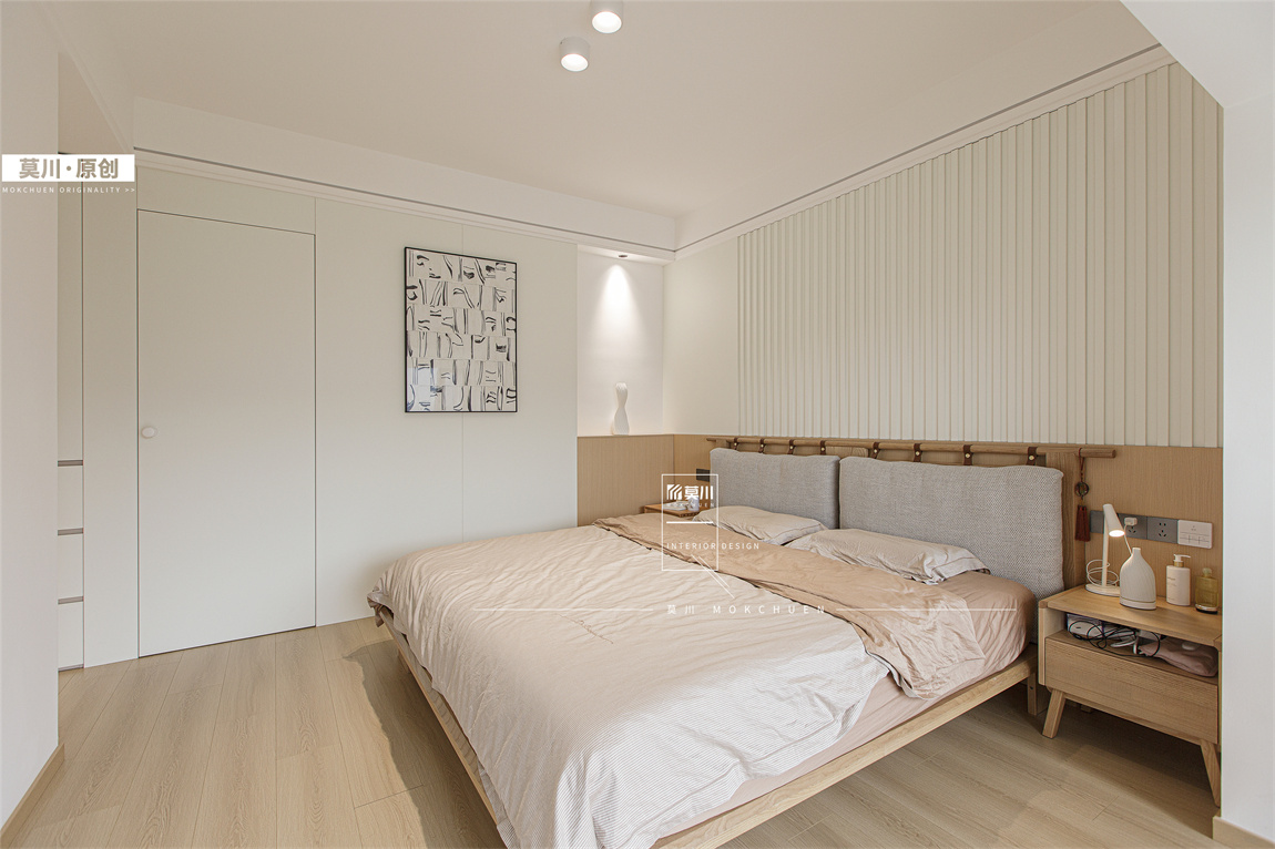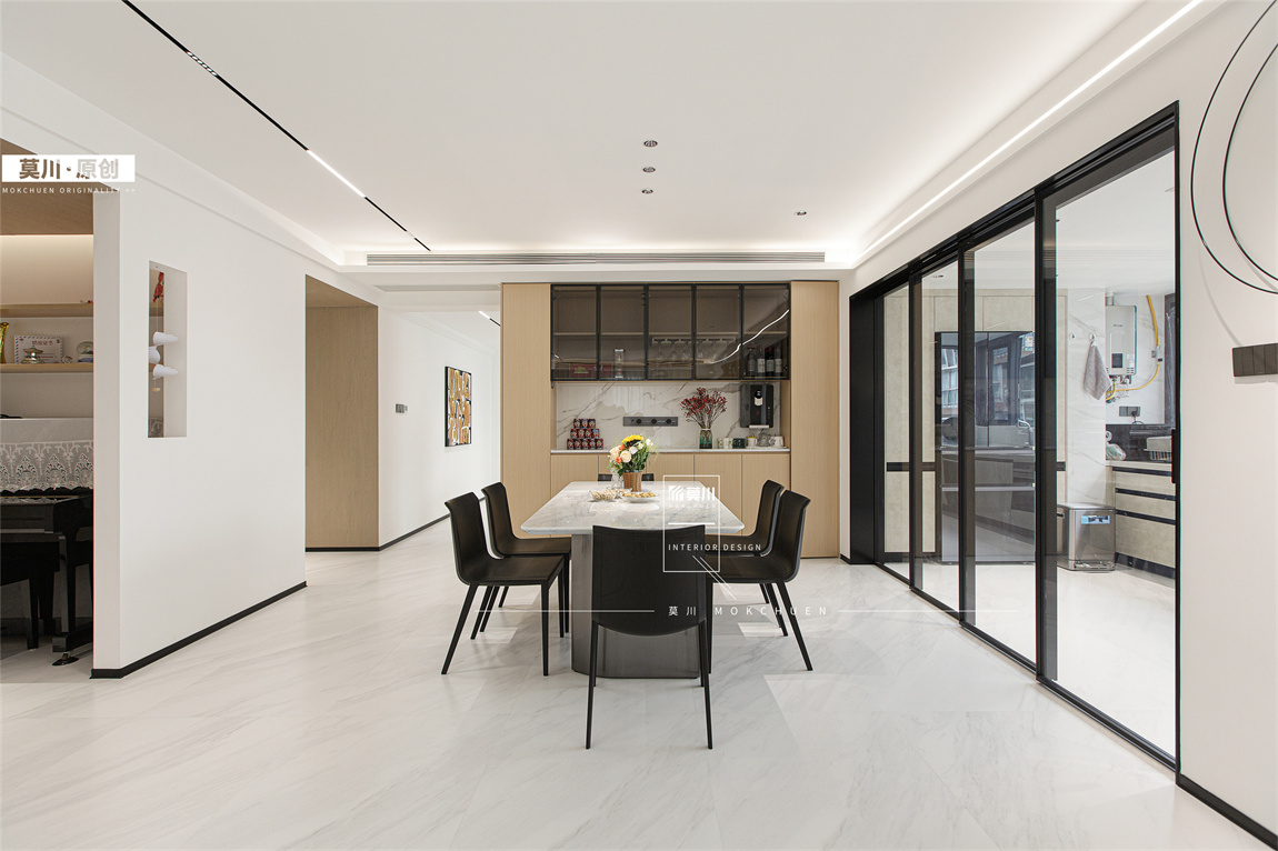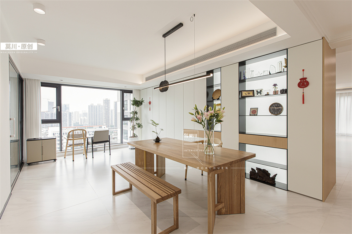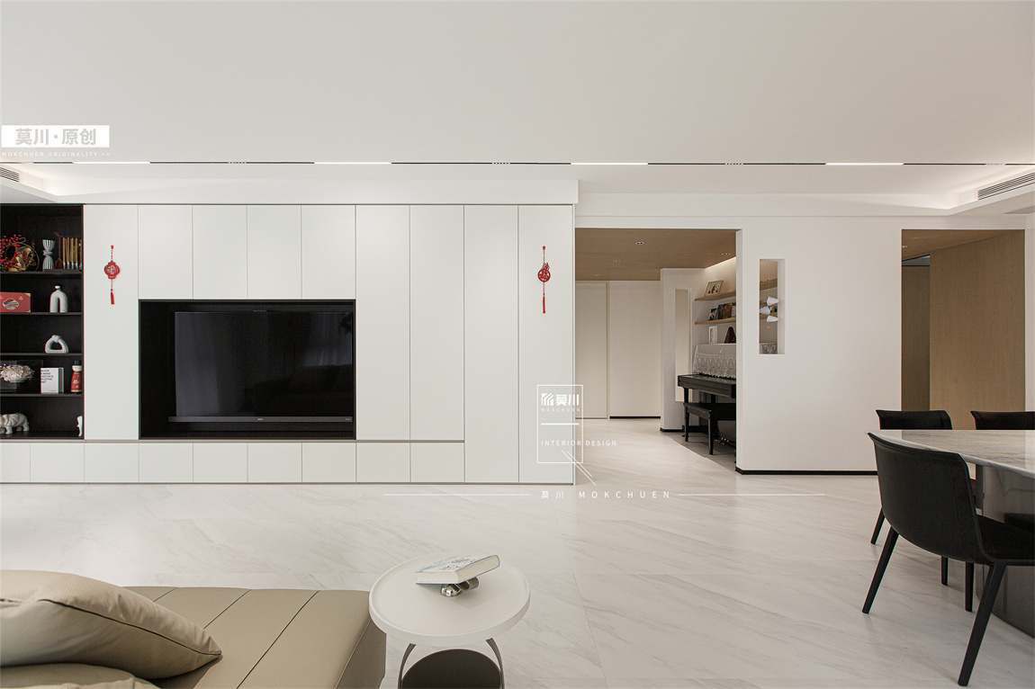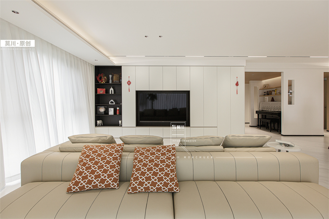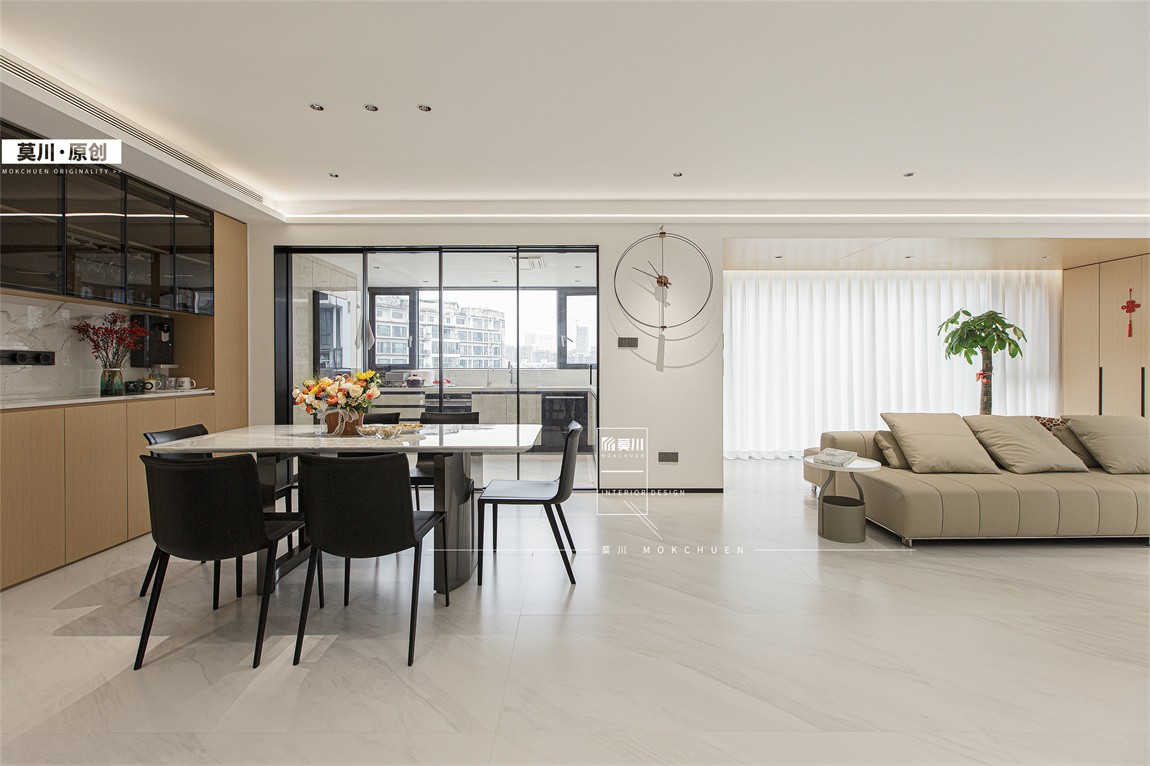 整體空間以柔和的木色簡約的白色為基調,溫暖又有自然的質感,詮釋了家的溫度。茶室寧靜素雅開放格的透光板增加燈光的層次也更好展示收藏,一幅靚麗的掛畫增加空間活力將視線引入過道走到客廳??蛷d餐邊柜木色與小朋友活動區(qū)整體木色增加空間的自然與溫馨感,柜體下面開放格方便小朋友玩具收納,對面的黑板漆特別選擇成了與木色同色的漆面而非常規(guī)的黑色。媽媽懷抱椅舒適放松與茶室掛畫呼應,電視背景墻巴士移門美觀又實用,雙面沙發(fā)一面觀影一面休閑,增加客廳多種社交模式,洄游過道天花與墻面整體統(tǒng)一木色,對面墻體則是作為小朋友的繪畫作品展示區(qū)與鋼琴練習區(qū),過道成為小朋友才藝展示,藝術與實用功能相結合。主臥沿用客廳色系基調,利用衣柜與墻體的凹位形成端景位,木飾面與背景墻連成一體,波浪板增加層次與五斗柜呼應。