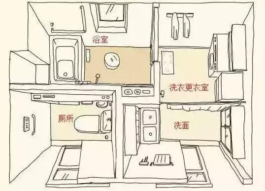2、在空間不足的情況下(一般來說套內(nèi)面積小于90平米),推薦將洗面臺和洗衣機放設(shè)置在同一個空間里形成一個緊湊式的洗衣洗面室,對于使用上影響并不大。這也是為什么我們說三式分離即可。